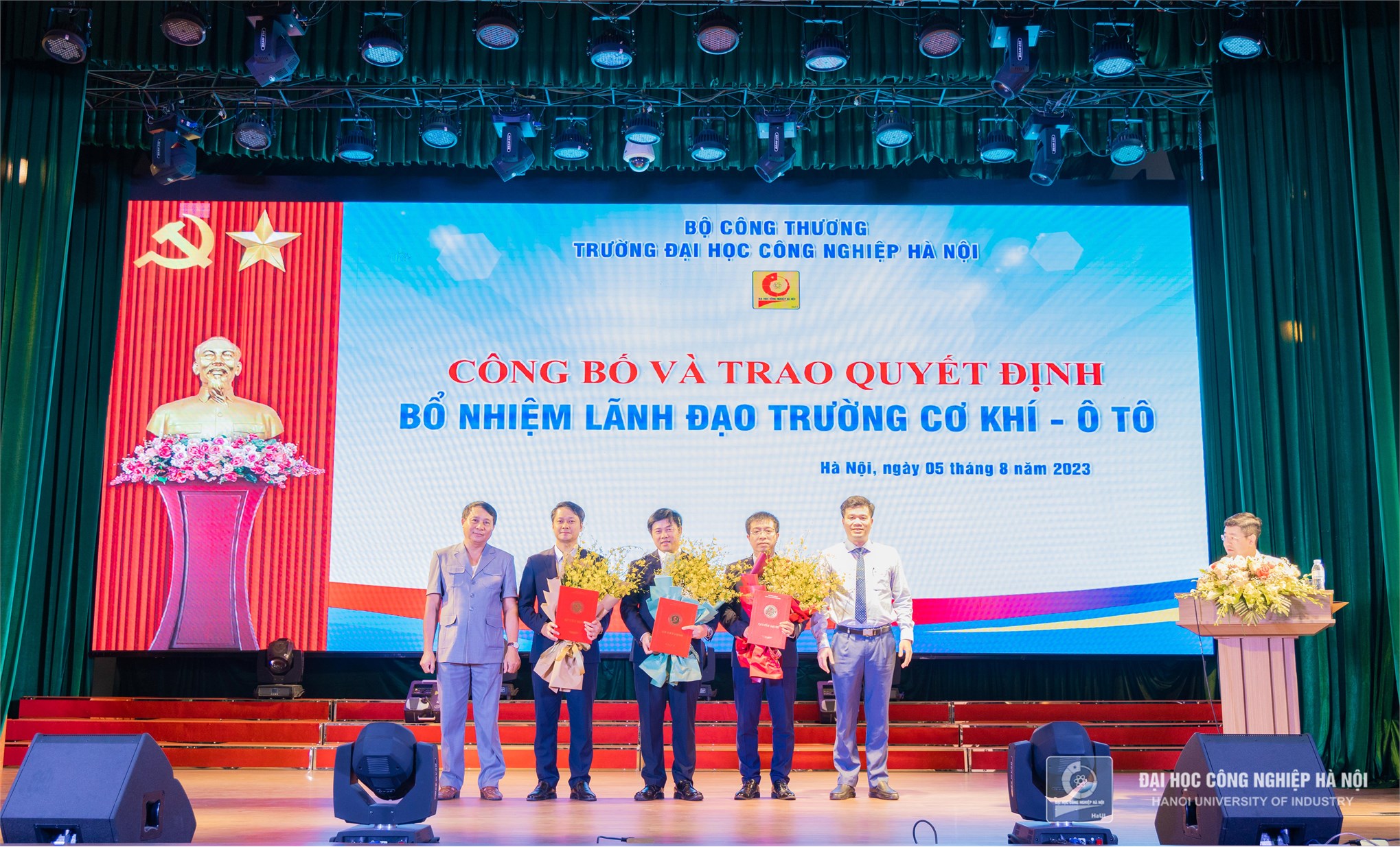 PGS.TS.Lê Hồng Quân - Bí thư Đảng ủy, Chủ tịch Hội đồng Trường và TS.Kiều Xuân Thực (ngoài cùng bên trái) – Hiệu trưởng Trường Đại học Công nghiệp Hà Nội trao quyết định thành lập Trường Cơ khí – Ô tô, thuộc Trường Đại học Công nghiệp Hà Nội. Ảnh HaUI