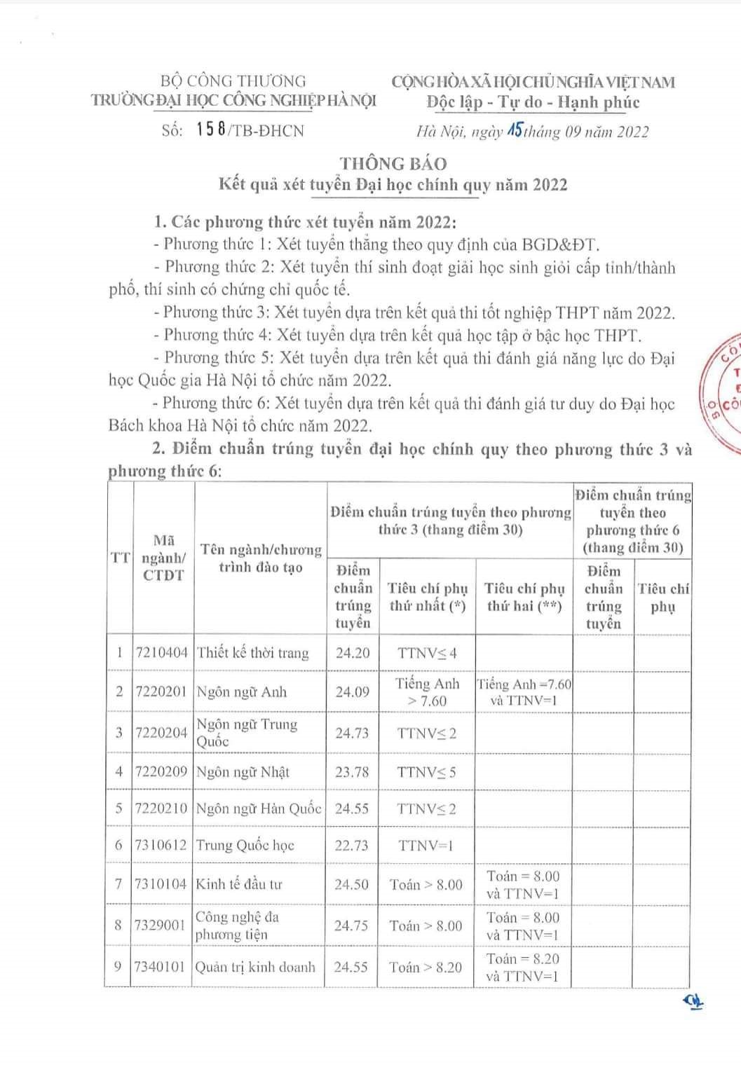 Điểm chuẩn trường Đại học Công nghiệp Hà Nội năm 2022. Ảnh: Chụp màn hình.