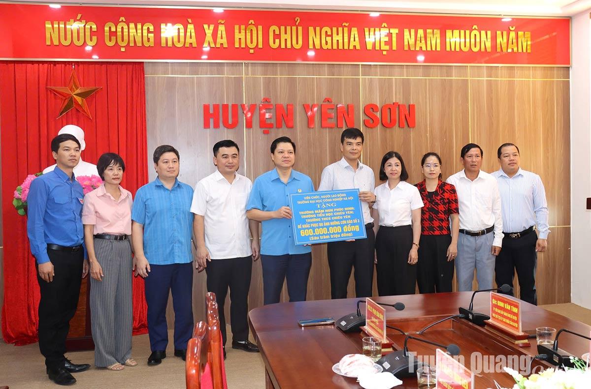 Đại diện Công đoàn Trường Đại học Công nghiệp Hà Nội trao 600 triệu đồng cho huyện Yên Sơn khắc phục hậu quả bão số 3 tại xã Phúc Ninh, Chiêu Yên.