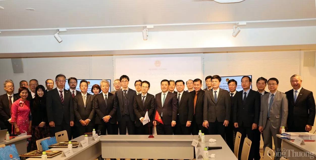 Bộ trưởng Nguyễn Hồng Diên cùng lãnh đạo các cục, vụ, đơn vị chức năng trong Bộ Công Thương, các trường học, doanh nghiệp, tập đoàn Việt Nam chụp ảnh chung với các doanh nghiệp, trường học Nhật Bản sau buổi làm việc