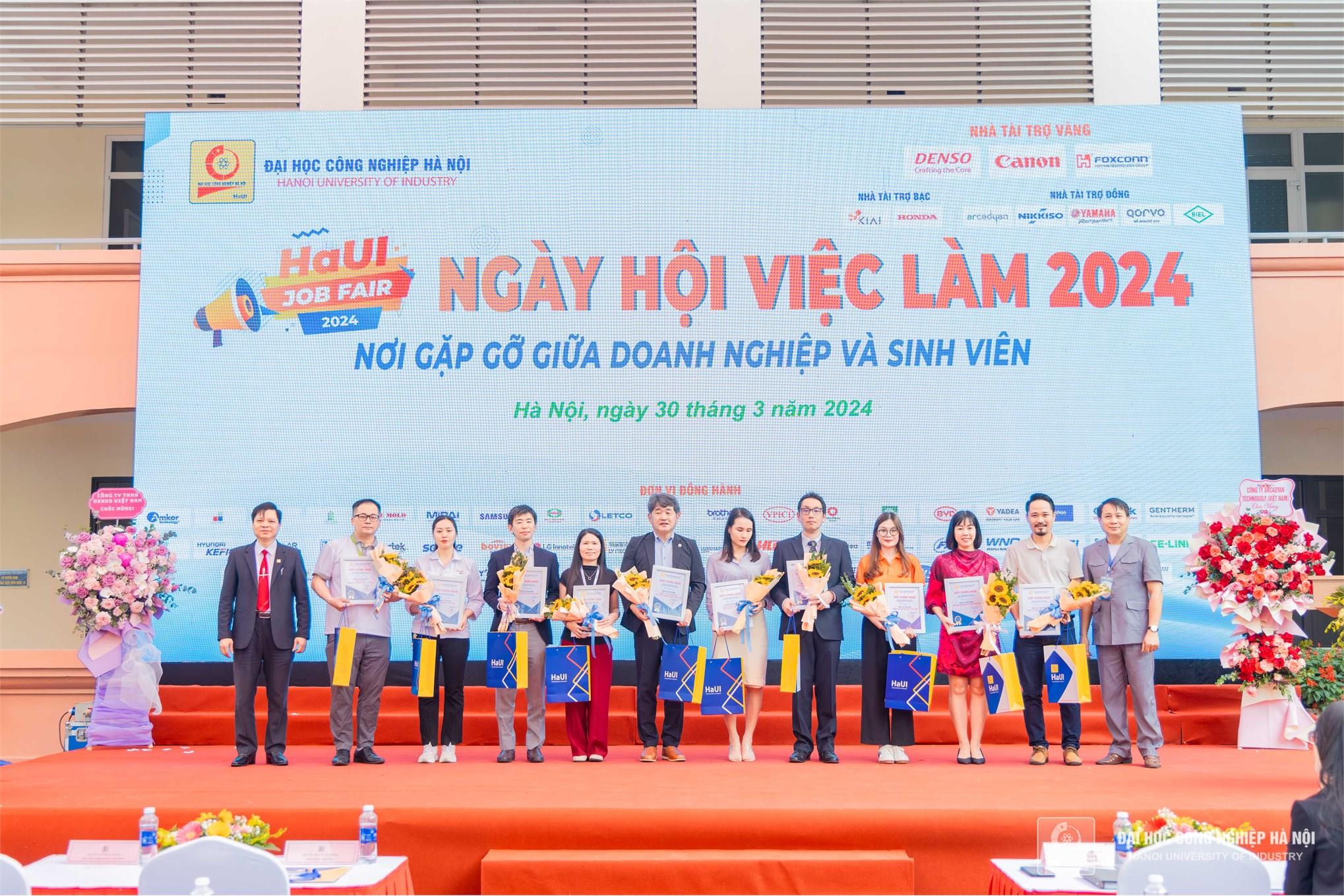 Lãnh đạo Trường Đại học Công nghiệp Hà Nội trao chứng nhận cho đại diện các nhà tài trợ
