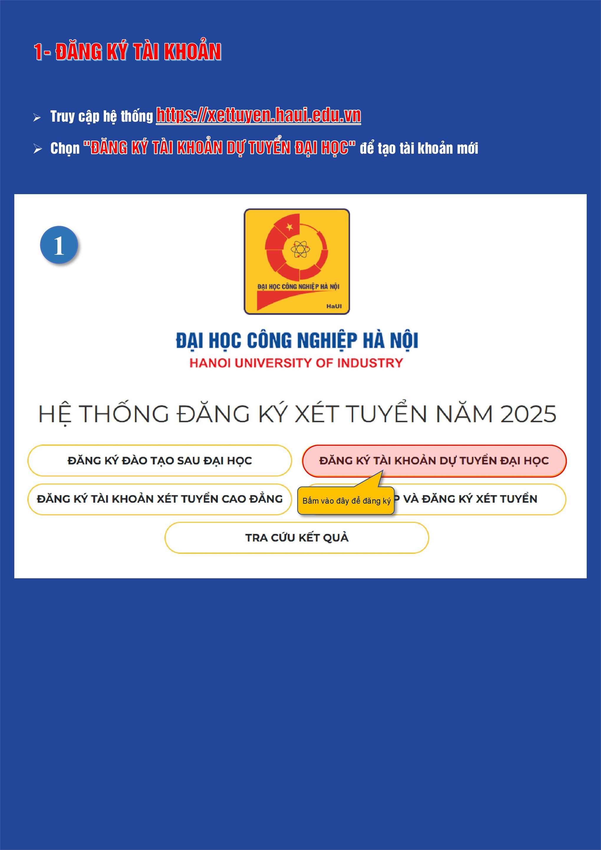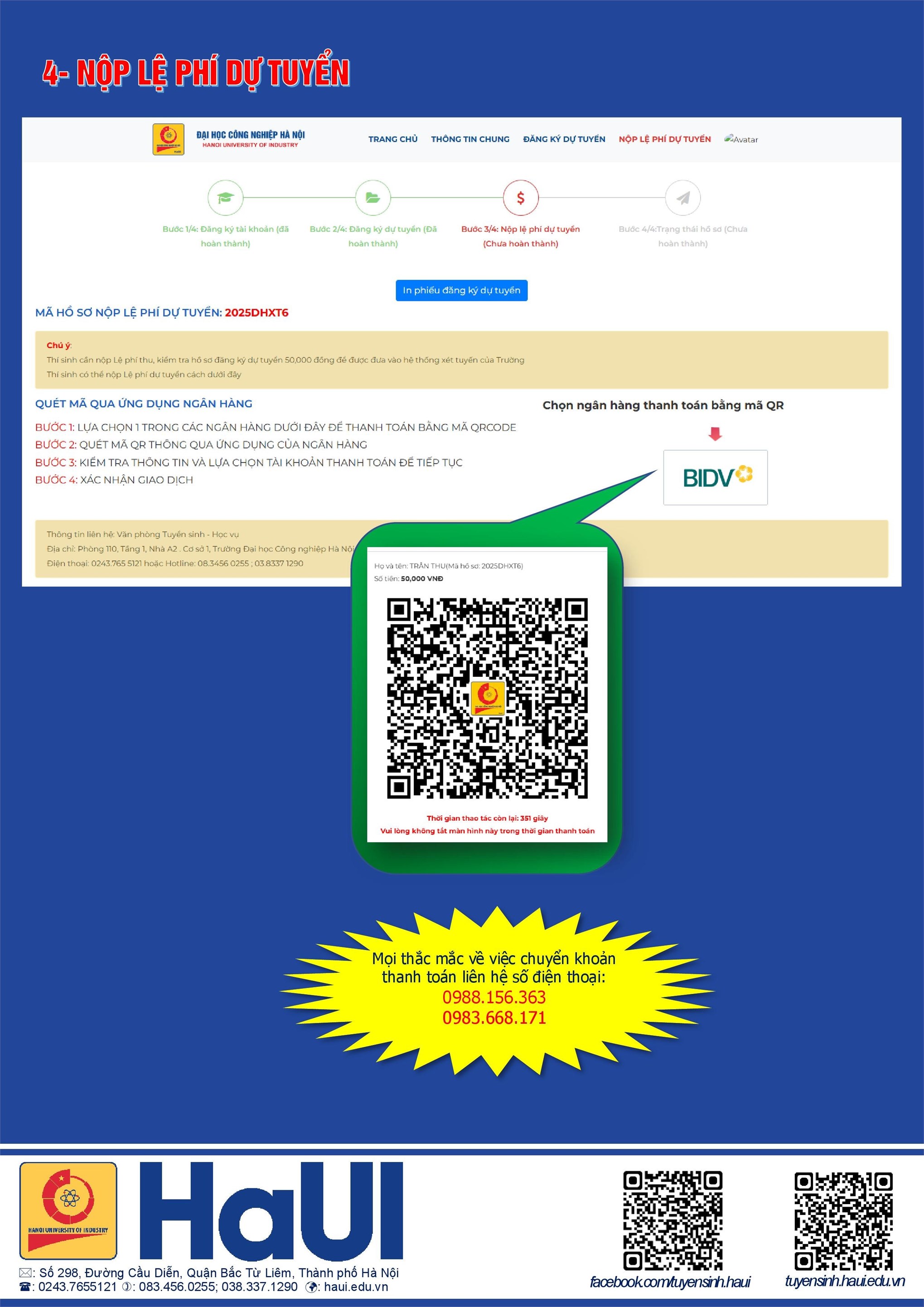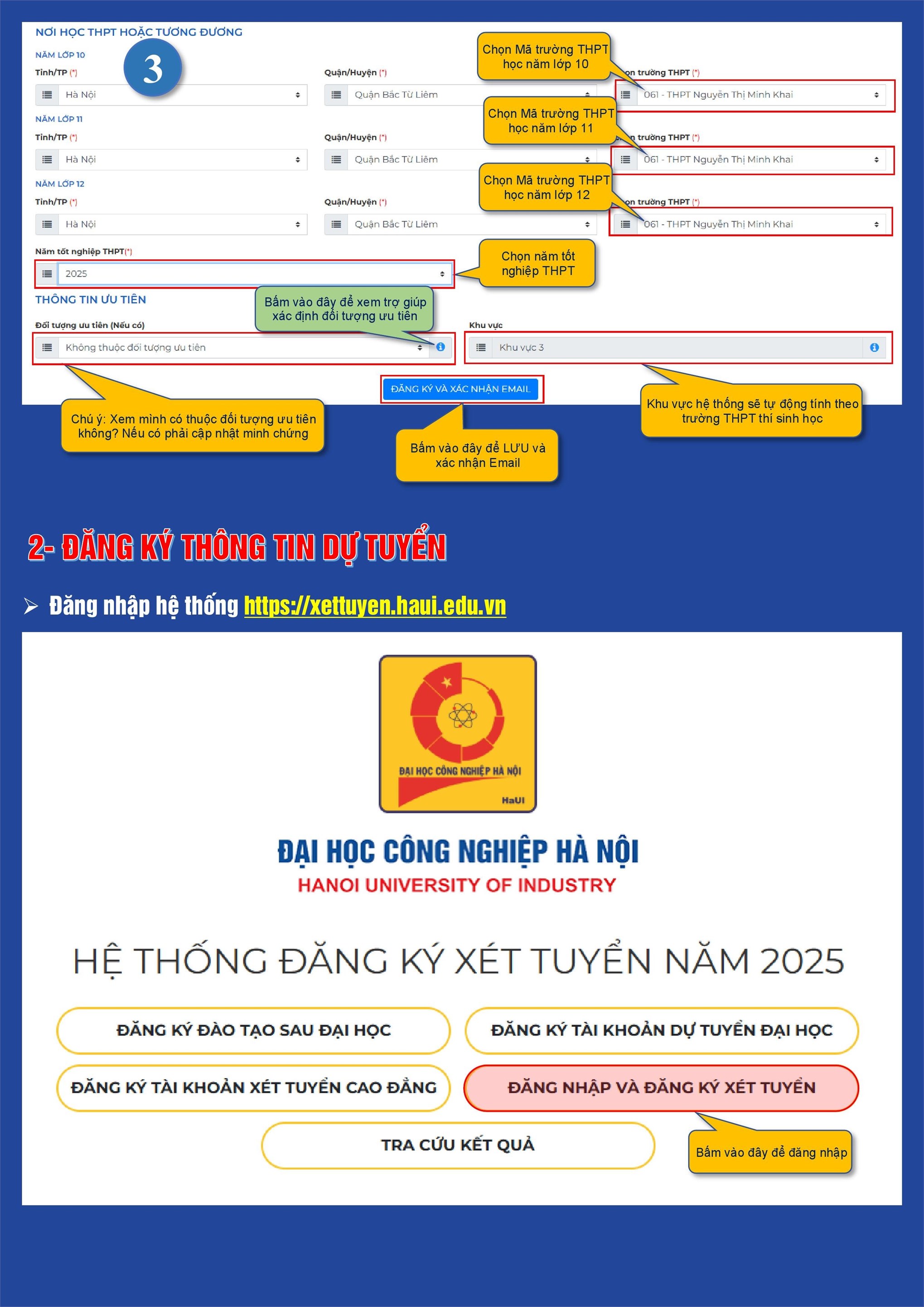 Hệ thống đăng ký xét tuyển đại học của Trường Đại học Công nghiệp Hà Nội chính thức mở từ ngày 15/5/2025 đến ngày 5/7/2025 tại: https://xettuyen.haui.edu.vn/. Thí sinh đọc kỹ hướng dẫn và làm theo nhằm đảm bảo điền đầy đủ, chính xác thông tin.