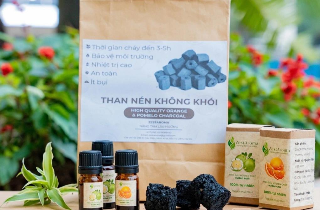 Phần rác thải sau quá trình tách tinh dầu đó được nhóm tiếp tục tận dụng để sản xuất viên than nén có thành phần chính từ các hợp chất tự nhiên có trong nguồn vỏ cam, bưởi.