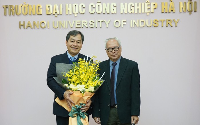 Cũng trong Sáng ngày 05/1, Tiến sĩ Lê Viết Khuyến - đại diện Hiệp hội Các trường đại học cao đẳng Việt Nam đã trao kỷ niệm chương vì sự nghiệp giáo dục đại học, cao đẳng Việt Nam và tặng hoa chúc mừng cho Phó Giáo sư, Tiến sĩ Trần Đức Qúy – Hiệu trưởng Trường Đại học Công nghiệp Hà Nội chia sẻ tại tọa đàm (Ảnh: Linh Trang)