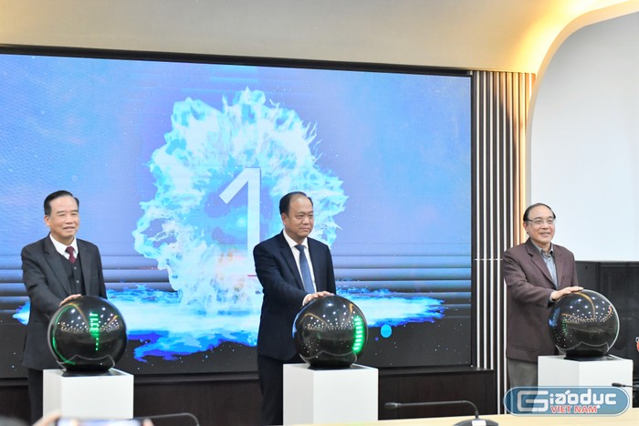Nghi thức khai trương tại Lễ kết nối Thư viện nhà trường với Trung tâm thư viện số dùng chung. (Ảnh: Huệ Mai).