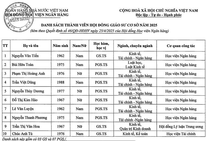Theo đó, Hội đồng Giáo sư cơ sở năm 2025 tại Học viện Ngân hàng gồm 10 thành viên (3 giáo sư, 7 phó giáo sư). Đối chiếu với danh sách đề cử ứng viên tham gia Hội đồng Giáo sư cơ sở của Hội đồng Khoa học và Đào tạo, danh sách chính thức không có gì thay đổi.