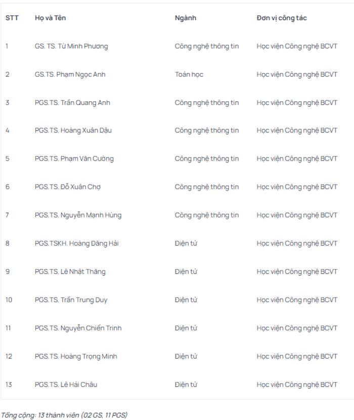 Trong đó, có 4 thành viên được mời tham gia bên ngoài là Giáo sư, Tiến sĩ Khoa học Nguyễn Công Định - Học viện Kỹ thuật Quân sư (Lĩnh vực chuyên môn: Điều kiển và tự động hóa); Giáo sư, Tiến sĩ Trần Thọ Đạt - Đại học Kinh tế Quốc dân (Lĩnh vực: Kinh tế); Giáo sư, Tiến sĩ Lê Kim Hùng - Trường Đại học Bách khoa, Đại học Đà Nẵng (Lĩnh vực chuyên môn: Điện) và Giáo sư, Tiến sĩ Trần Xuân Tú - Đại học Quốc gia Hà Nội (Lĩnh vực: Điện tử).