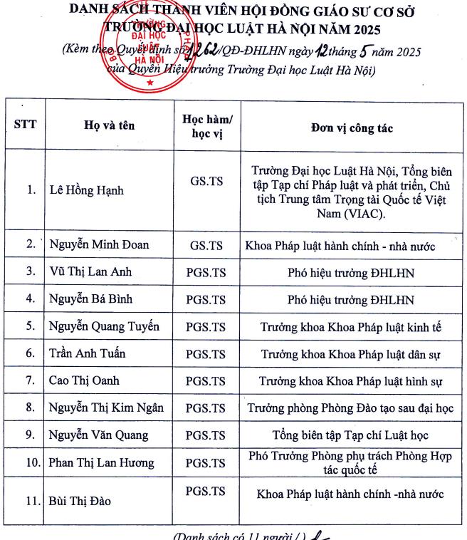 Trường Đại học Luật Hà Nội: Hiệu trưởng Trường Đại học Luật Hà Nội đã ban hành Quyết định về việc thành lập Hội đồng Giáo sư cơ sở Trường Đại học Luật Hà Nội năm 2025. Danh sách bao gồm 11 thành viên (2 giáo sư, 9 phó giáo sư). So sánh với danh sách đề cử thành viên tham gia Hội đồng Giáo sư cơ sở, số lượng thành viên giảm 2 phó giáo sư.