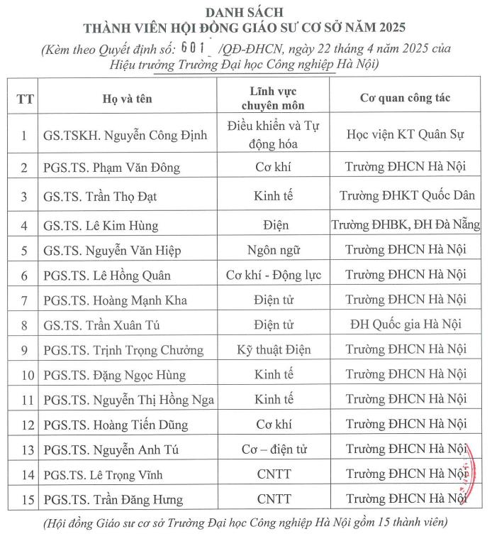 Trường Đại học Công nghiệp Hà Nội: Hiệu trưởng Trường Đại học Công nghiệp Hà Nội đã ban hành Quyết định thành lập Hội đồng Giáo sư cơ sở năm 2025. Danh sách gồm 15 thành viên (5 giáo sư, 10 phó giáo sư).
