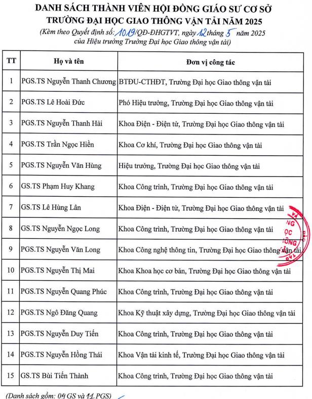 Trường Đại học Giao thông vận tải: Hiệu trưởng Trường Đại học Giao thông vận tải đã ban hành quyết định về việc thành lập Hội đồng giáo sư cơ sở năm 2025. Danh sách bao gồm 15 thành viên (4 giáo sư, 11 phó giáo sư). Tất cả các thầy/cô hiện đều đang công tác tại Trường Đại học Giao thông vận tải.