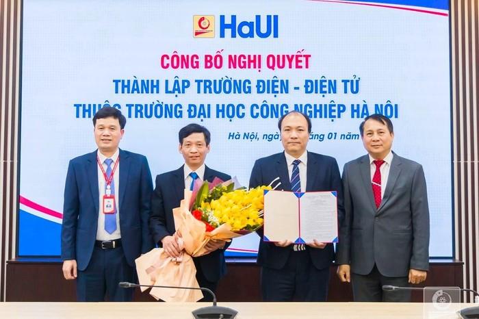 Đại diện Trường Điện - Điện tử nhận nghị quyết thành lập từ lãnh đạo Trường Đại học Công nghiệp Hà Nội. Ảnh: HaUI.