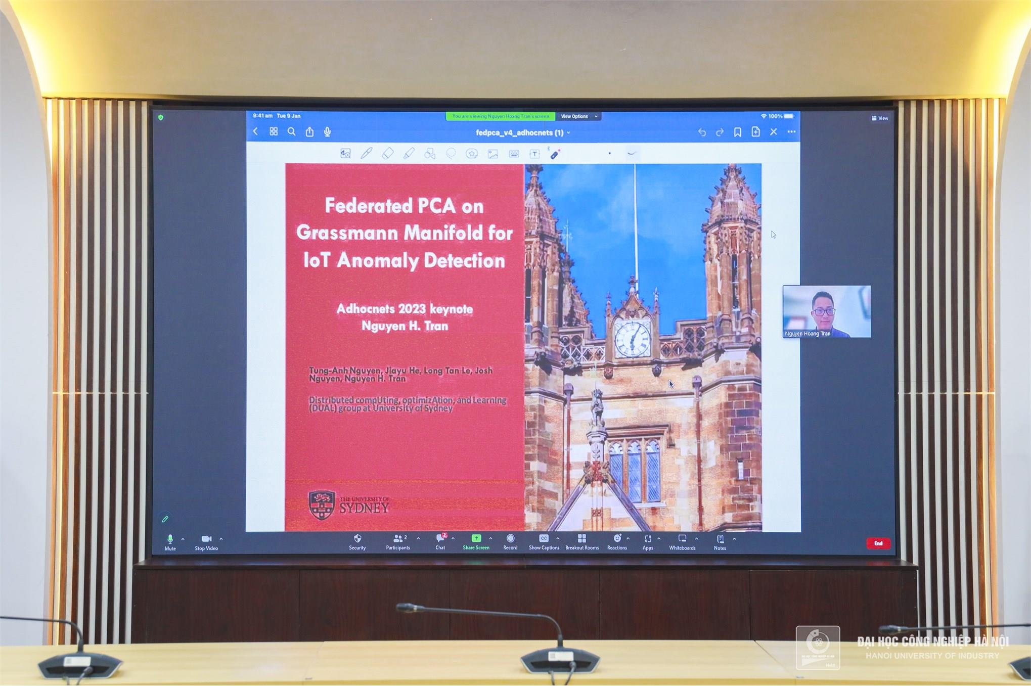 PGS.TS.Trần Hoàng Nguyên – Đại học Sydney trình bày đề tài “Kỹ thuật PCA phân tán cho hệ thống phát hiện bất thường trong IOT” (Ảnh: HaUI)