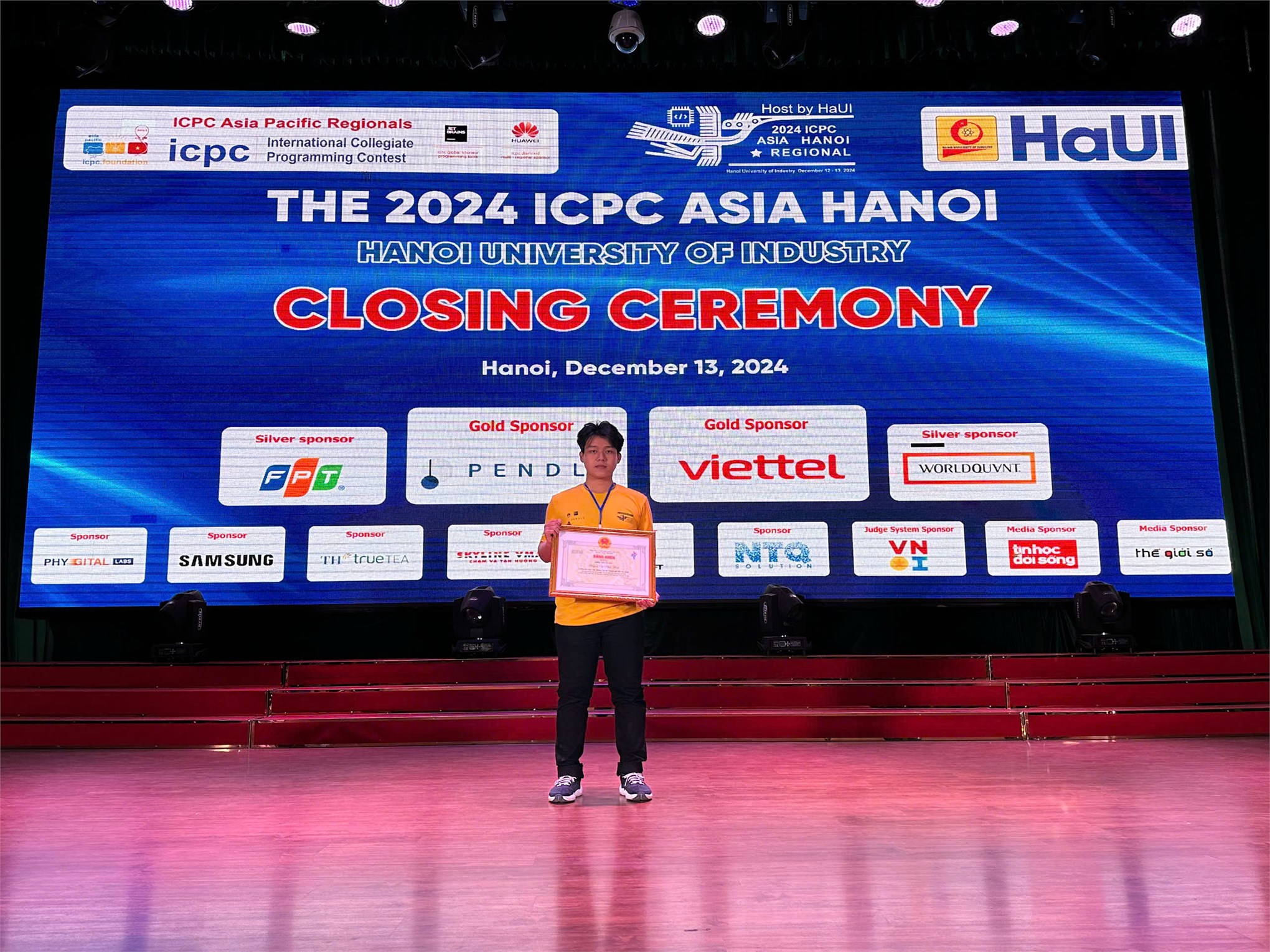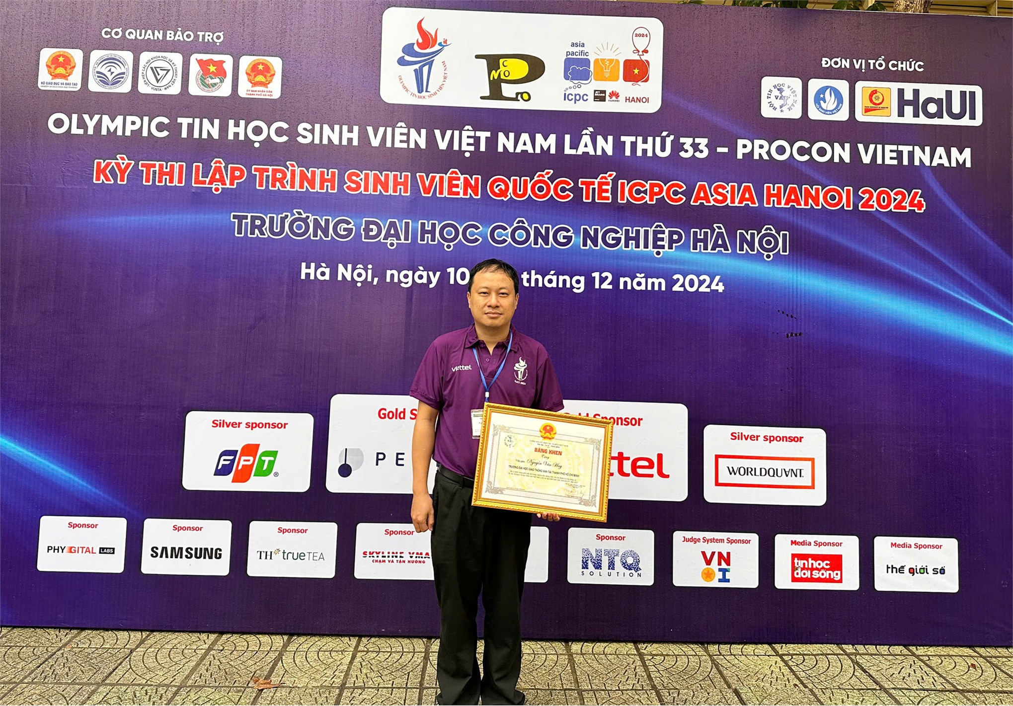 ThS Nguyễn Văn Huy, giảng viên Viện Công nghệ thông tin và Điện, điện tử nhận Bằng khen của Hội Tin học Việt Nam vì đã có nhiều đóng góp xuất sắc trong công tác bồi dưỡng sinh viên đạt thành tích cao trong các Kỳ thi Olympic Tin học sinh viên Việt Nam và Kỳ thi Lập trình sinh viên Quốc tế ICPC năm 2024.
