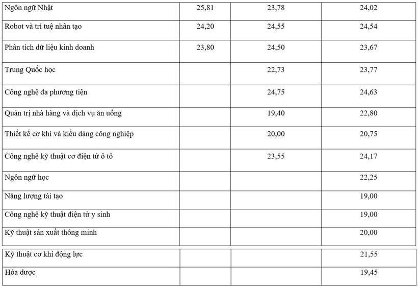 Kế đến là các ngành Công nghệ kỹ thuật cơ điện tử, Công nghệ kỹ thuật điều khiển và tự động hóa với điểm sàn 22 trở lên. Thấp nhất là các ngành Ngôn ngữ học, Trung Quốc học, Công nghệ kỹ thuật hóa học, Công nghệ kỹ thuật môi trường, Công nghệ dệt may, Quản trị nhà hàng và dịch vụ ăn uống - cùng lấy điểm sàn 18.