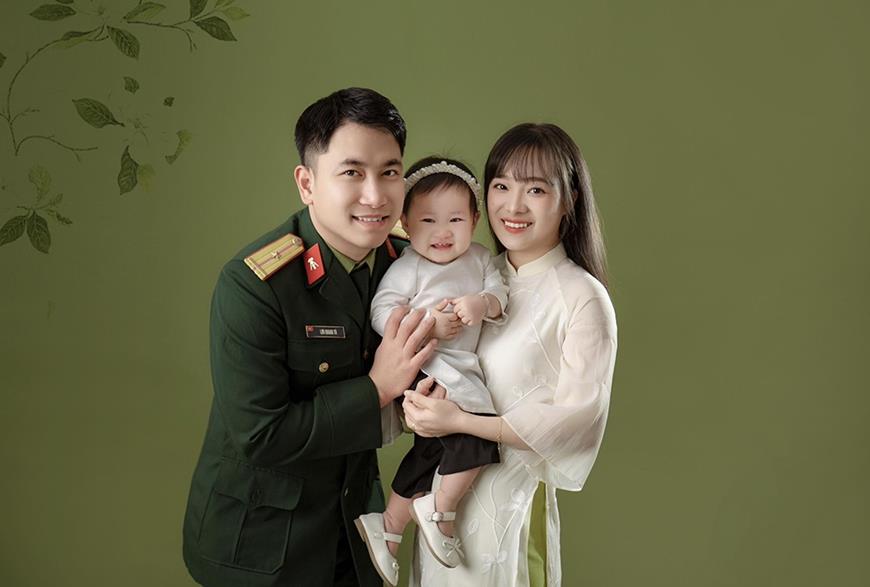 Nhân dịp con gái tròn một tuổi, gia đình Thiếu úy QNCN Lưu Quang Tú (nhân viên kỹ thuật, Xưởng X202, Kho KT788, Cục Kỹ thuật Binh chủng, Tổng cục Kỹ thuật) đi chụp hình kỷ niệm để lưu lại những khoảnh khắc đẹp bên nhau. Từng cử chỉ chăm sóc vợ và con gái của anh khiến mọi người xung quanh cảm nhận được sự ấm áp của tổ ấm nhỏ.