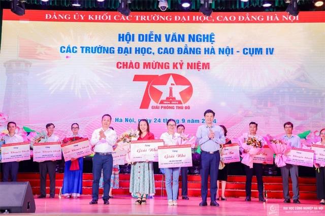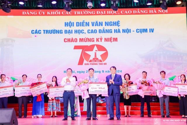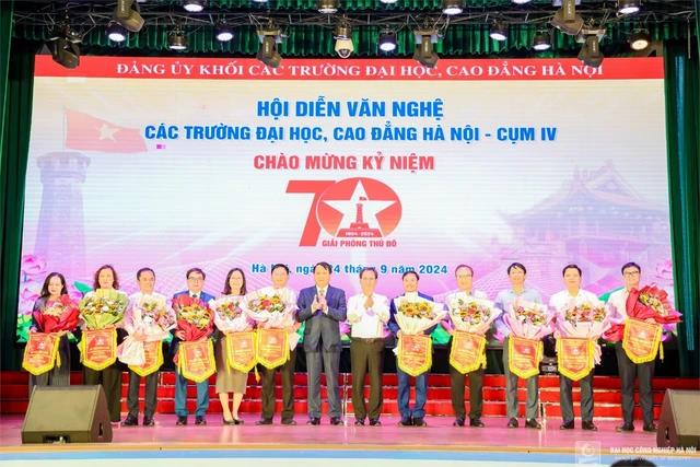 Đồng chí Nguyễn Thanh Sơn – Thành ủy viên, Bí thư Đảng ủy Khối các trường đại học, cao đẳng Hà Nội và đồng chí Lê Hồng Quân - Bí thư Đảng ủy, Chủ tịch Hội đồng Trường, Trường Đại học Công nghiệp Hà Nội, Trưởng ban tổ chức Hội diễn Cụm IV trao cờ lưu niệm cho 13 đội thi