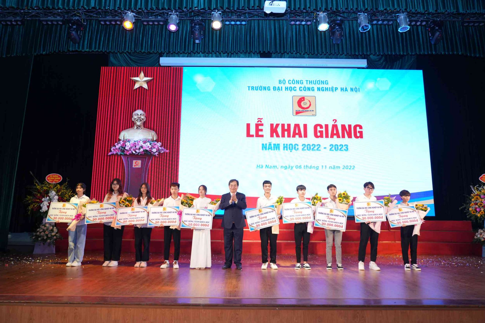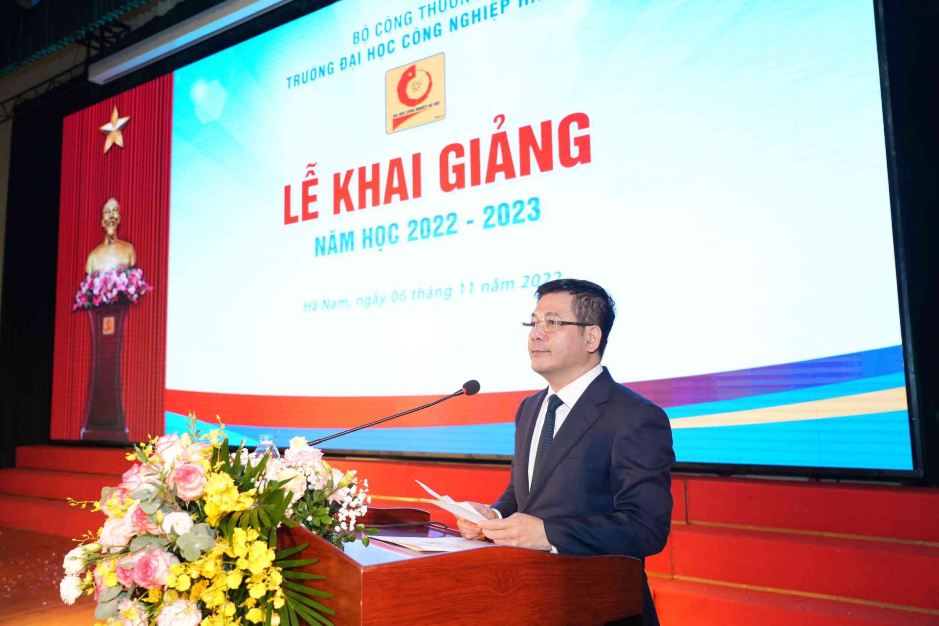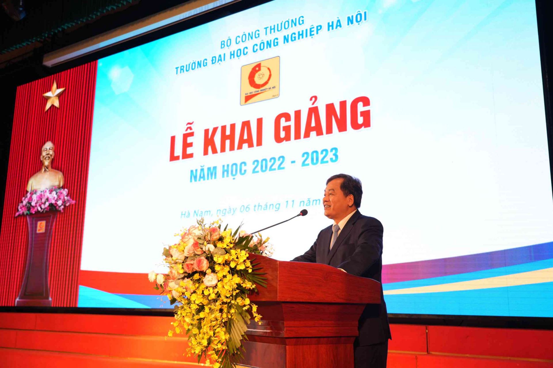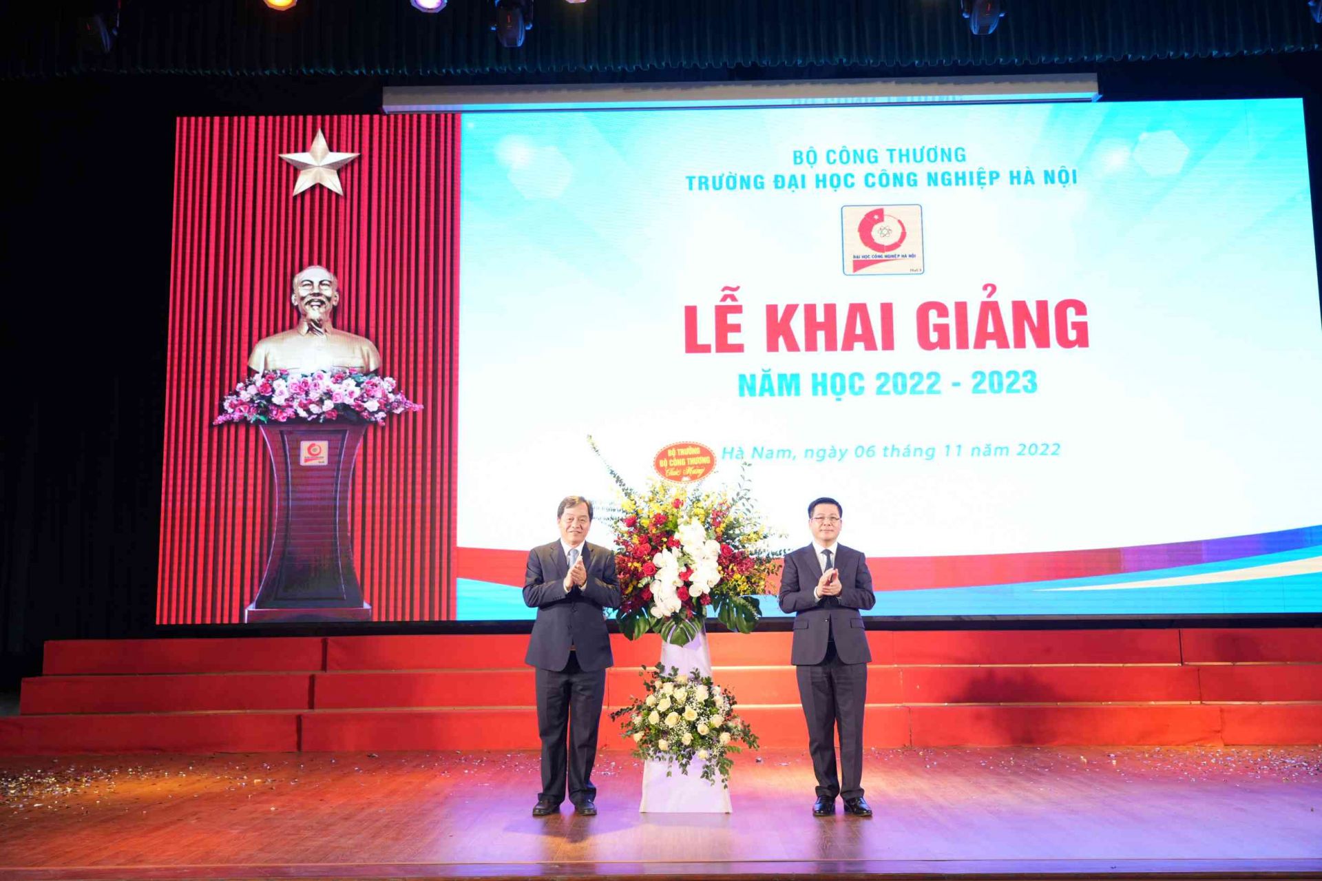 Bộ trưởng Bộ Công Thương Nguyễn Hồng Diên tặng hoa chúc mừng Trường Đại học Công nghiệp Hà Nội tại Lễ khai giảng năm học 2022-2023