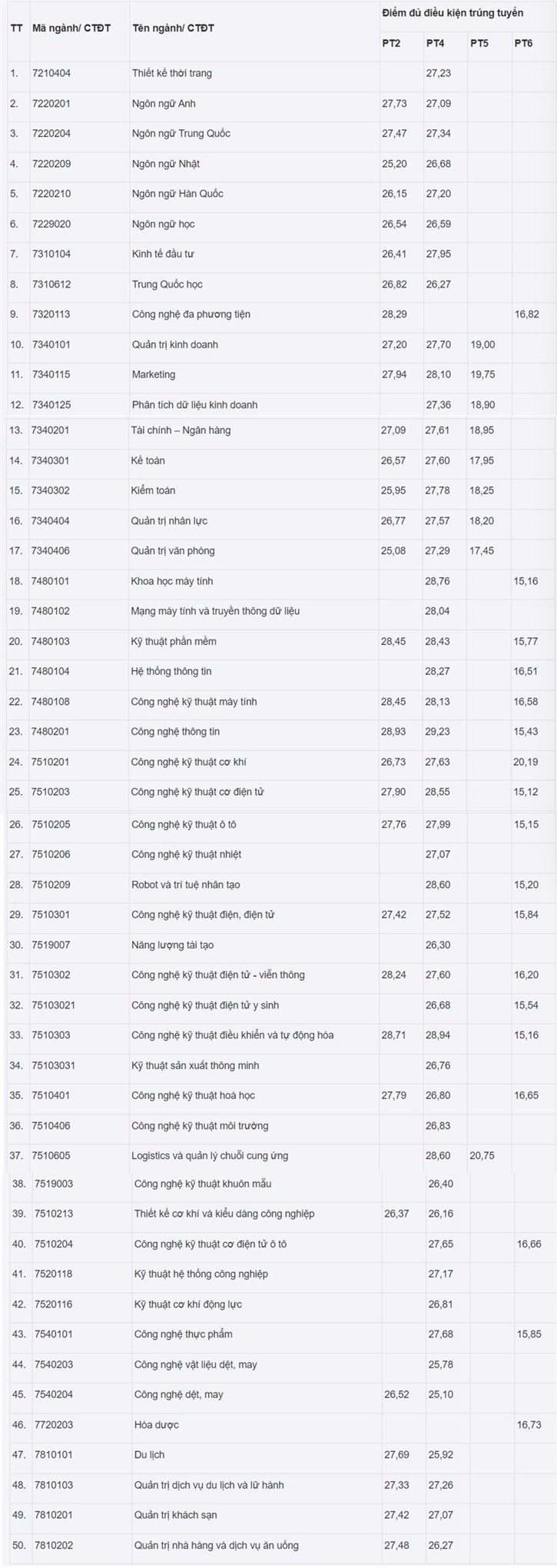 Năm nay, nhóm ngành có điểm chuẩn cao nhất là công nghệ thông tin, thương mại điện tử, tự động hóa… từ 25 điểm trở lên. Tùy theo mỗi phương thức xét tuyển mà ngành Sư phạm Tiếng Anh lấy 27 – 29 điểm, tiếp sau là Công nghệ thông tin 26,75 – 28,75 điểm; Robotvà trí tuệ nhân tạo và Công nghệ kỹ thuật điều khiển và tự động hóa 25,25 điểm; Logistic và quản lý chuỗi cung ứng 25- 28,25 điểm….