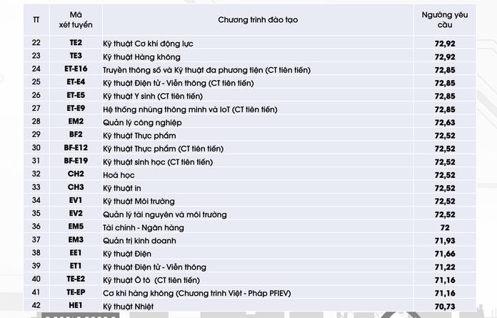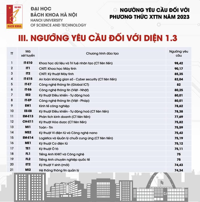 Đại học Bách khoa Hà Nội hiện mới công bố điểm chuẩn phương thức xét tuyển tài năng. Theo đó, Khoa học dữ liệu và Trí tuệ nhân tạo (IT-E10) có mức điểm chuẩn cao nhất 98.42 điểm.
