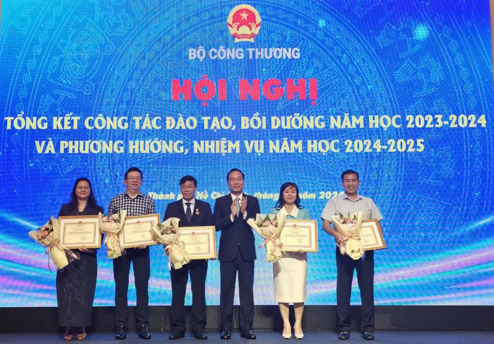 Ông Trần Quang Huy, Uỷ viên Ban Cán sự Đảng, Vụ trưởng Vụ Tổ chức cán bộ (Bộ Công Thương) trao tặng thưởng danh hiệu Tập thể Lao động xuất sắc cho 5 Trường thuộc Bộ Công Thương đã có thành tích xuất sắc trong năm học 2023 - 2024, gồm: Trường Đại học Kinh tế - Kỹ thuật Công nghiệp; Trường Đại học Công nghiệp Thành phố Hồ Chí Minh; Trường Đại học Công Thương Thành phố Hồ Chí Minh; Trường Cao đẳng Kinh tế đối ngoại; Trường Cao đẳng Kinh tế - Kỹ thuật Thương mại.