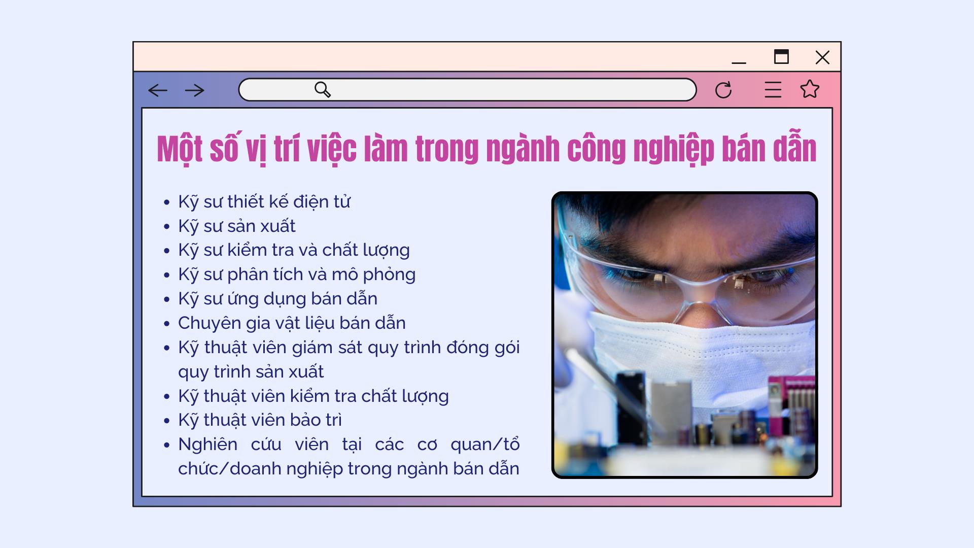 Sự tăng trưởng mạnh mẽ của ngành công nghiệp bán dẫn không chỉ là một tín hiệu đáng mừng cho thấy lĩnh vực này đang phát triển với tốc độ chóng mặt, mà còn là một "cú hích" tạo ra làn sóng cơ hội việc làm mới đầy tiềm năng cho các bạn trẻ. Đây là thời điểm vàng để các bạn trẻ nắm bắt cơ hội, trang bị cho mình những kiến thức, kỹ năng cần thiết để lựa chọn và dấn thân vào lĩnh vực này.