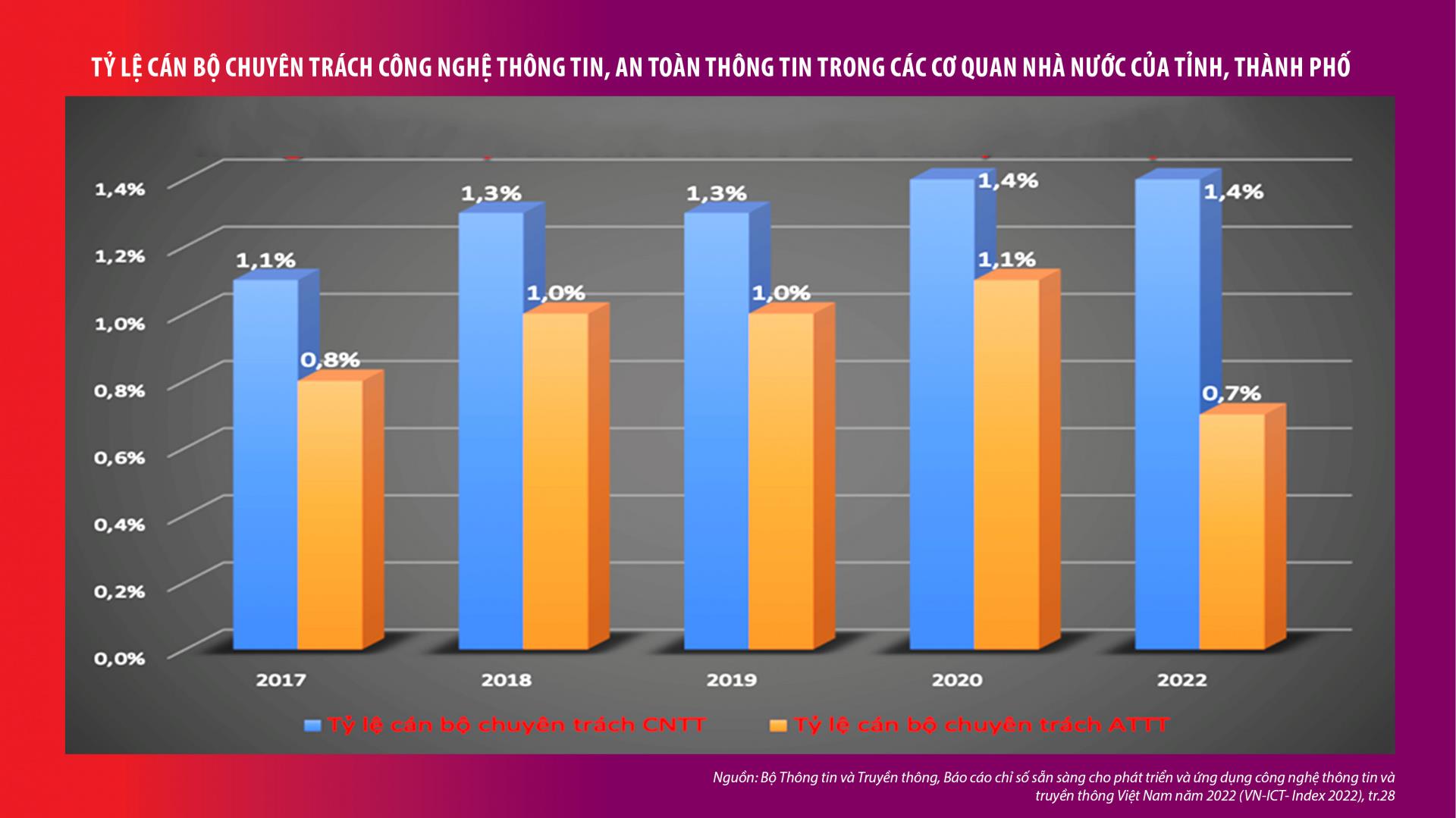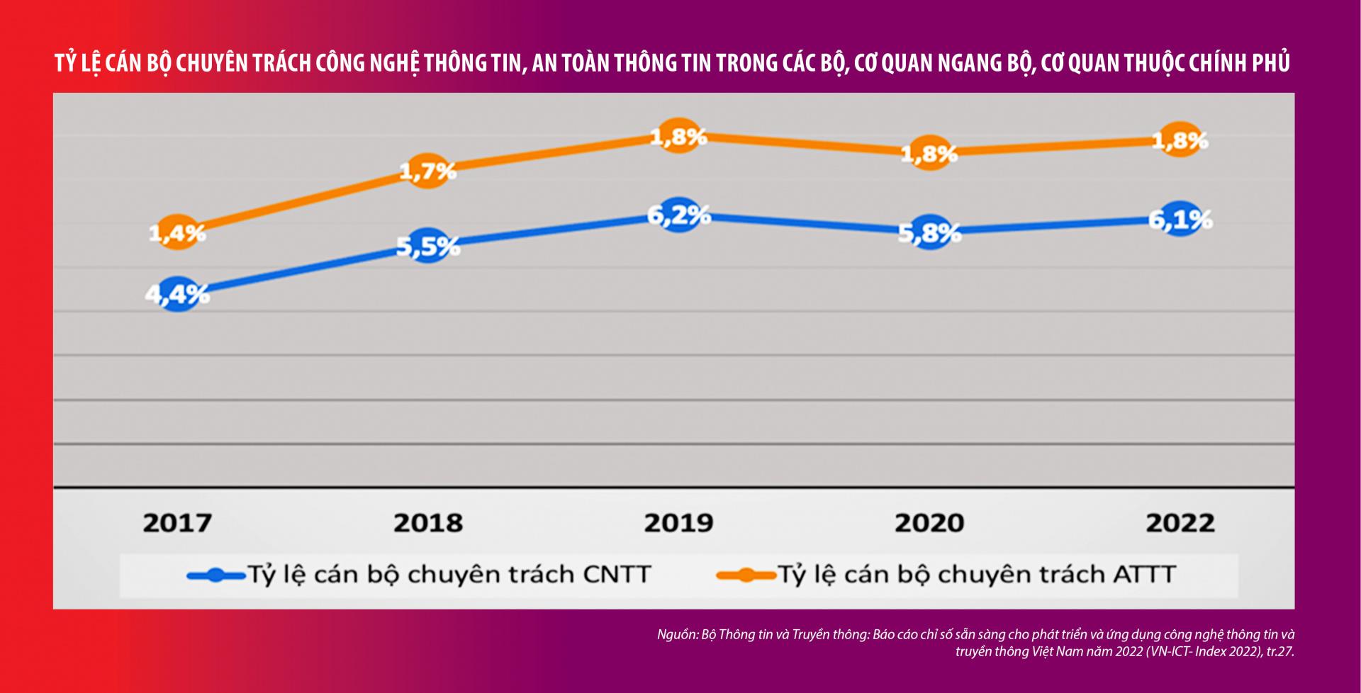 Tỷ lệ cán bộ chuyên trách về công nghệ thông tin và an toàn thông tin ngày càng được bổ sung, phát triển, góp phần nâng cao năng lực số trong bộ máy quản lý. Giai đoạn 2017-2022, tại các bộ, cơ quan ngang bộ và cơ quan thuộc Chính phủ, tỷ lệ cán bộ chuyên trách công nghệ thông tin đạt gần 2%, trong khi tỷ lệ cán bộ chuyên trách an ninh thông tin tăng thêm 0,4%. Ở cấp địa phương, tỷ lệ cán bộ chuyên trách công nghệ thông tin trong các cơ quan nhà nước tại các tỉnh, thành phố cũng ghi nhận mức tăng 0,3% trong cùng giai đoạn.