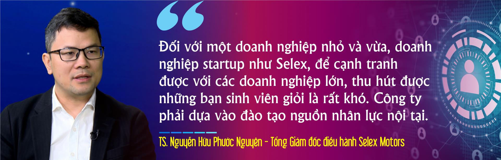 Để giải quyết bài toán thiếu hụt nhân lực, sự phối hợp giữa doanh nghiệp và cơ sở đào tạo đóng vai trò quan trọng. Để khắc phục tình trạng thiếu hụt nguồn nhân lực về chuyển đổi số trong sản xuất công nghiệp, Công ty CP Phương tiện điện thông minh Selex (Selex Motors) lại có cách làm rất thiết thực. TS.Nguyễn Hữu Phước Nguyên - Tổng Giám đốc điều hành Selex Motors cho biết, doanh nghiệp cũng gặp những khó khăn tương tự về nguồn nhân lực. Đối với một doanh nghiệp nhỏ và vừa, doanh nghiệp startup như Selex, để cạnh tranh được với các doanh nghiệp lớn, thu hút được những bạn sinh viên giỏi là rất khó. Thu hút những người làm việc giỏi lại có kinh nghiệm giỏi càng khó hơn. Do đó, theo TS.Nguyên, Công ty phải dựa vào đào tạo nguồn nhân lực nội tại. Doanh nghiệp này đã triển khai các chương trình đào tạo dài hạn dành cho sinh viên năm cuối, kéo dài từ 6 tháng đến 1,5 năm. Thông qua mô hình này, Công ty chủ động đào tạo nguồn nhân lực nội tại, đồng thời xây dựng đội ngũ nhân sự nòng cốt để dẫn dắt các thế hệ tiếp theo.