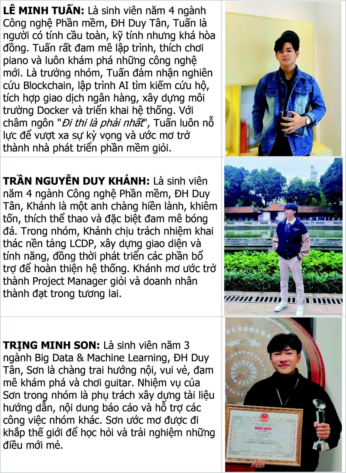 Thầy đã định hướng phát triển ứng dụng minh bạch hóa giao dịch bằng Blockchain và AI tìm kiếm cứu hộ, giúp đội tạo nên sự khác biệt. Chiến thắng này không chỉ là thành quả của đội mà còn là minh chứng cho sự tận tâm và trách nhiệm của thầy - người đã truyền cho chúng em ngọn lửa đam mê và cống hiến".