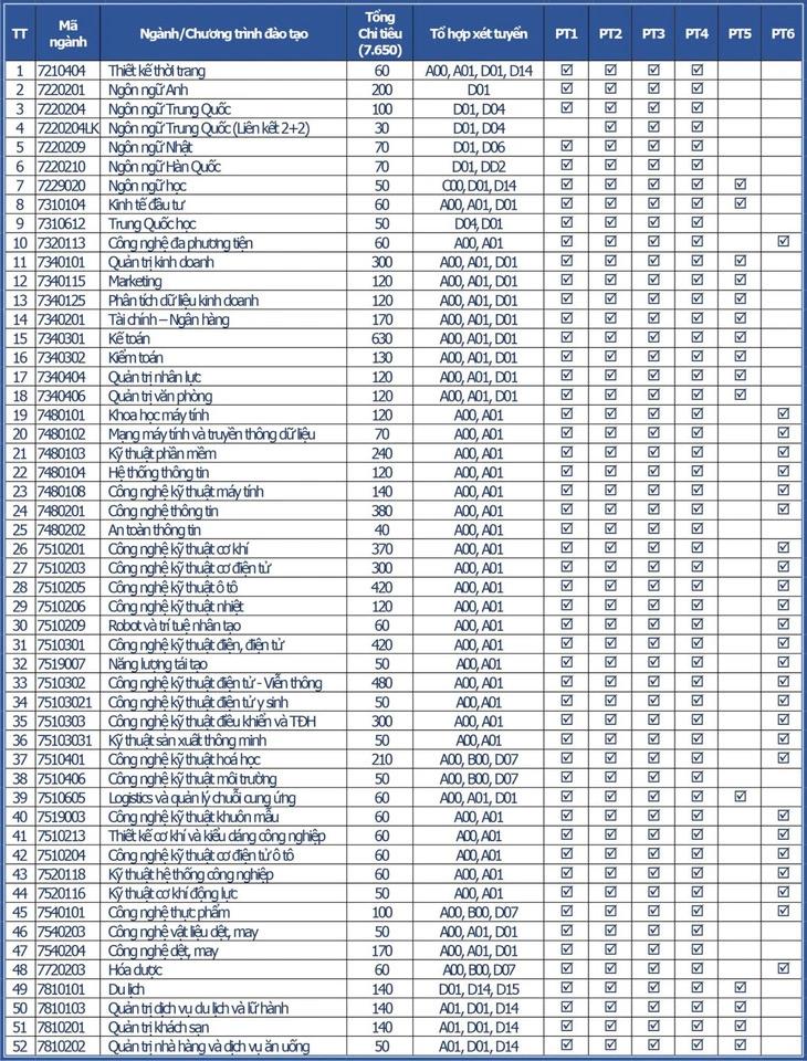 Năm 2024, trường tuyển sinh 52 ngành/chương trình đào tạo đại học chính quy với 7.650 chỉ tiêu.
