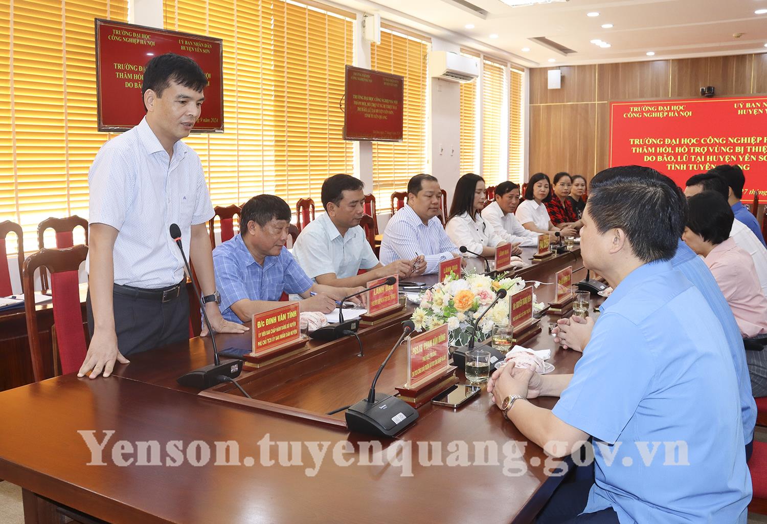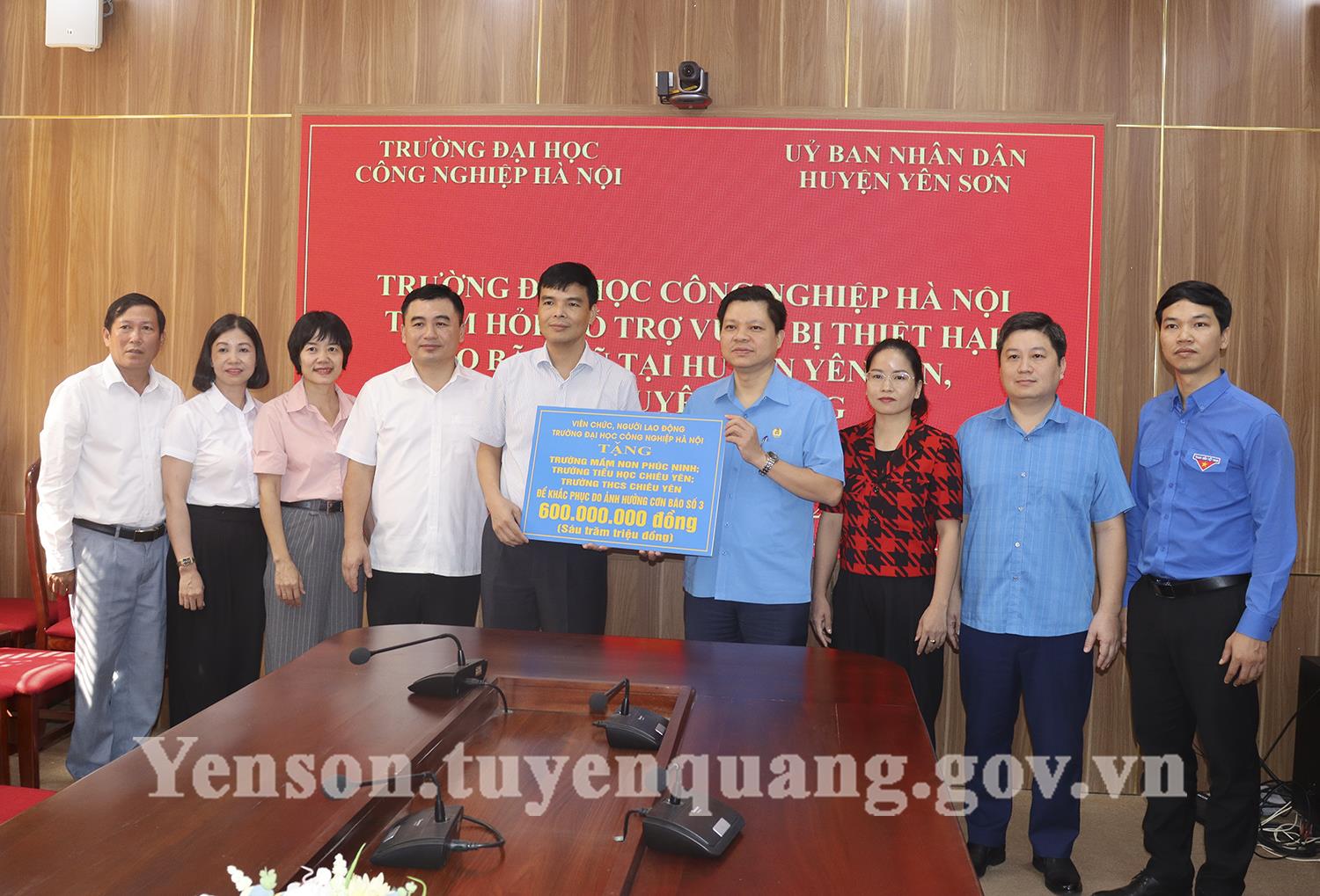 Sáng ngày 27/9, tại Hội trường tầng 2 UBND huyện Yên Sơn, Đoàn công tác của Trường Đại học Công nghiệp Hà Nội do đồng chí PGS.TS Phạm Văn Đông - Phó Hiệu trưởng, Chủ tịch công đoàn làm trưởng đoàn đã trao 600 triệu đồng cho trường Mầm non xã Phúc Ninh; trường Tiểu học, trường THCS xã Chiêu Yên khắc phục thiệt hại do ảnh hưởng của cơn bão số 3. Lãnh đạo huyện Yên Sơn dự chương trình có đồng chí Đinh Văn Tính, Ủy viên BCH Đảng bộ huyện, Phó Chủ tịch UBND huyện; lãnh đạo một số cơ quan, đơn vị của huyện.