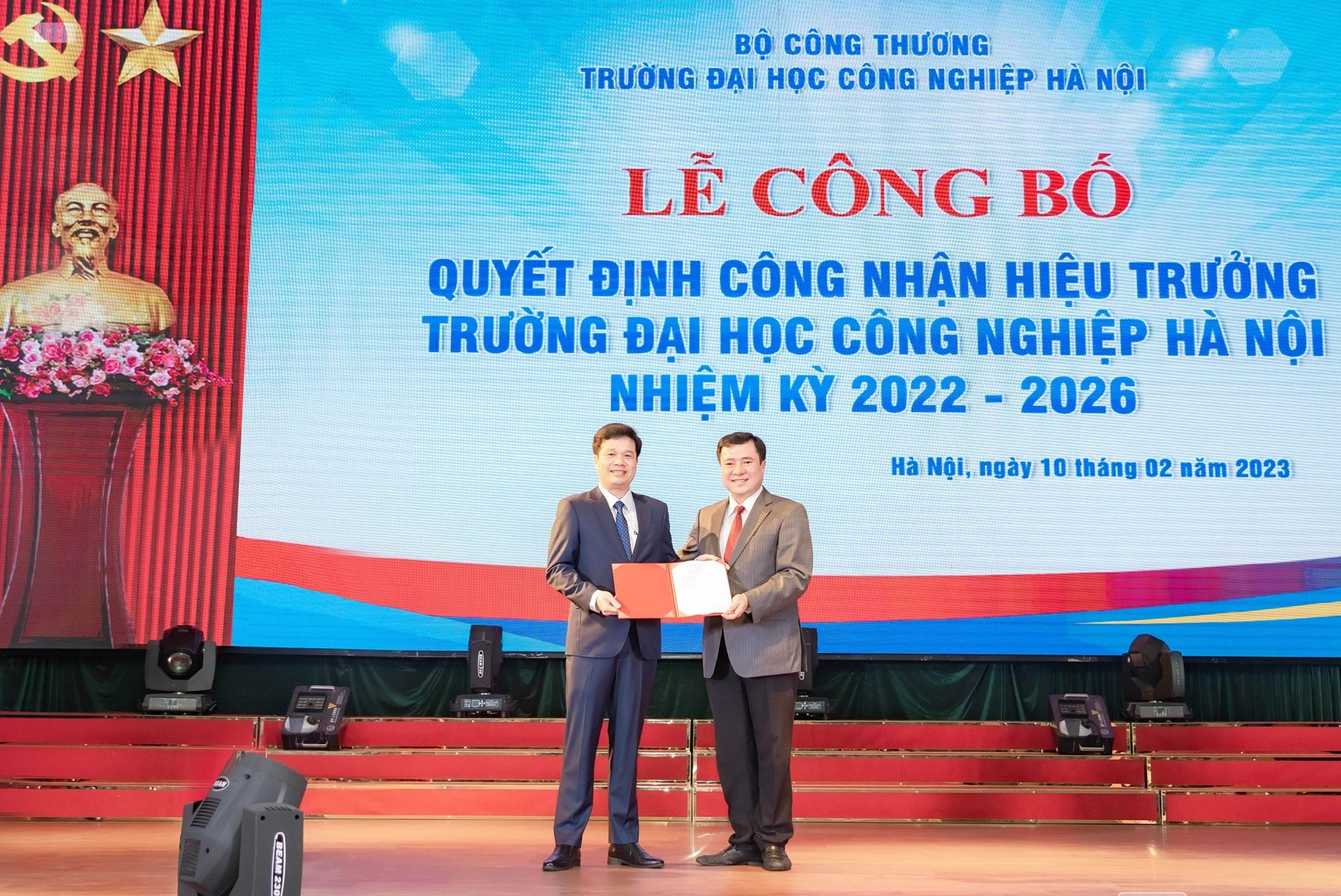 Thứ trưởng Bộ Công thương Nguyễn Sinh Nhật Tân (phải) trao quyết định công nhận hiệu trưởng Trường ĐH Công nghiệp Hà Nội nhiệm kỳ 2022 - 2026 cho TS.Kiều Xuân Thực (trái).