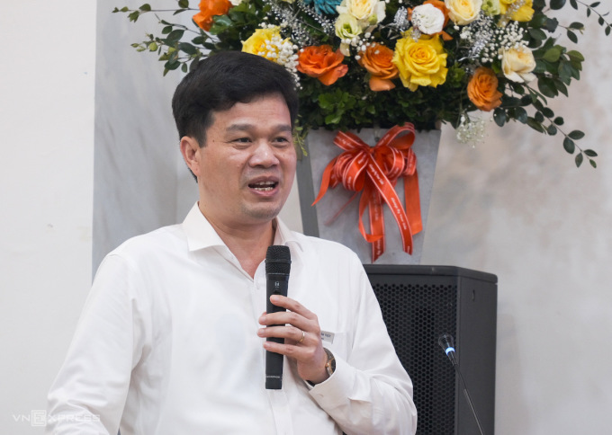 Ông Kiều Xuân Thực, Hiệu trưởng Đại học Công nghiệp Hà Nội, chia sẻ trong lễ ra mắt ban cố vấn doanh nghiệp, ngày 22/4. Ảnh: Dương Tâm