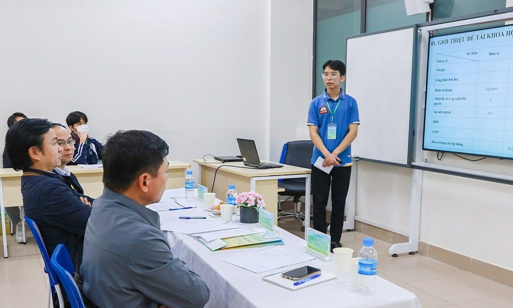 Trần Chí Cường thay mặt nhóm trình bày báo cáo "Nghiên cứu lý thuyết về thay đổi môi chất lạnh R410A bằng R32 trong máy điều hòa không khí dân dụng" tại diễn đàn Sinh viên nghiên cứu khoa học 2022, sáng 25/2. Ảnh: HaUI