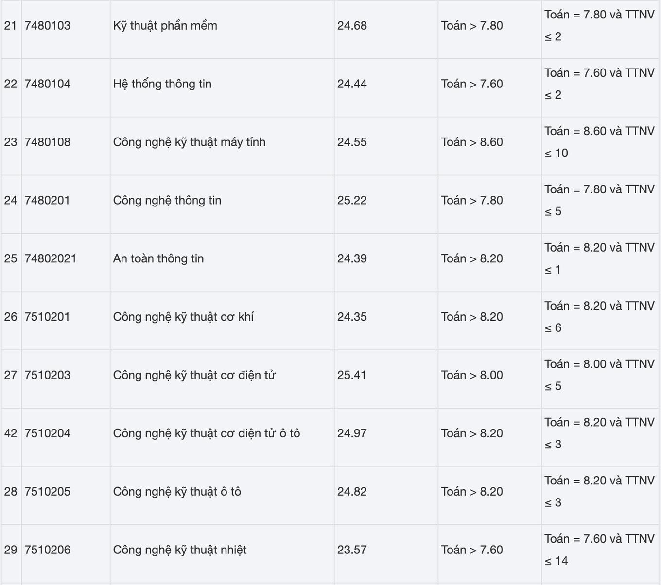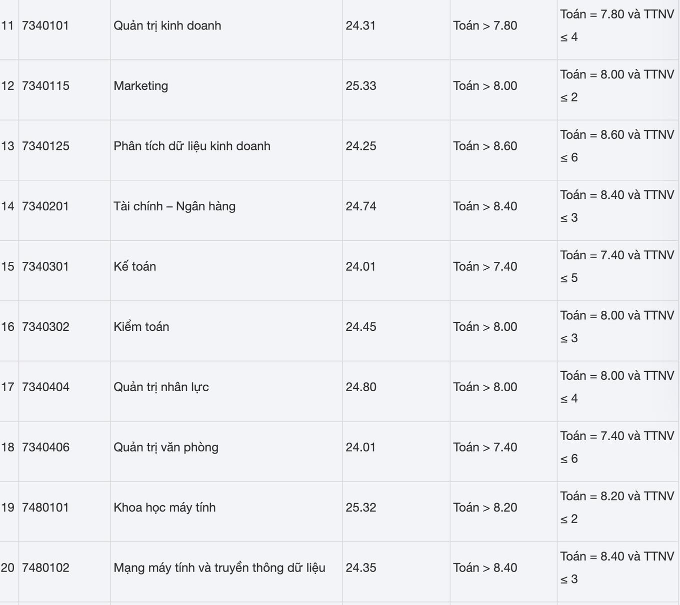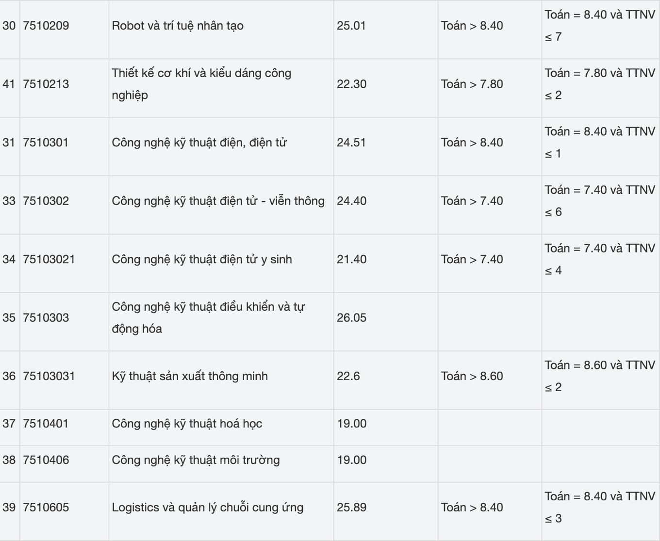 Xếp sau đó là các ngành Logistics và quản lý chuỗi cung ứng (25,89 điểm), Ngôn ngữ Trung Quốc (25,58 điểm), Công nghệ kỹ thuật cơ điện tử (25,41 điểm), Marketing (25,33 điểm), Khoa học máy tính (25,32 điểm).