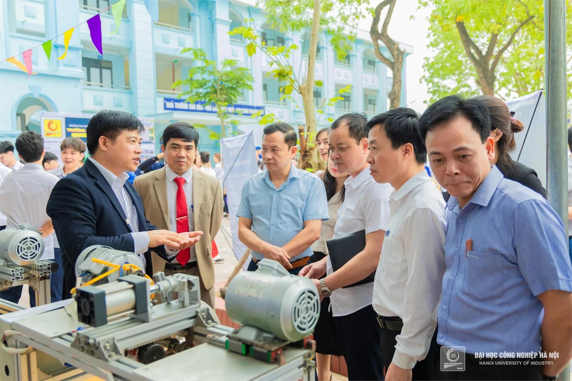 PGS.TS. Hoàng Tiến Dũng – Hiệu trưởng Trường Cơ khí – Ô tô, Đại học Công nghiệp Hà Nội, thầy Nguyễn Thanh Hải – Phó Trưởng phòng Giáo dục và Đào tạo huyện Phúc Thọ tham quan gian hàng sản phẩm sáng tạo STEM.