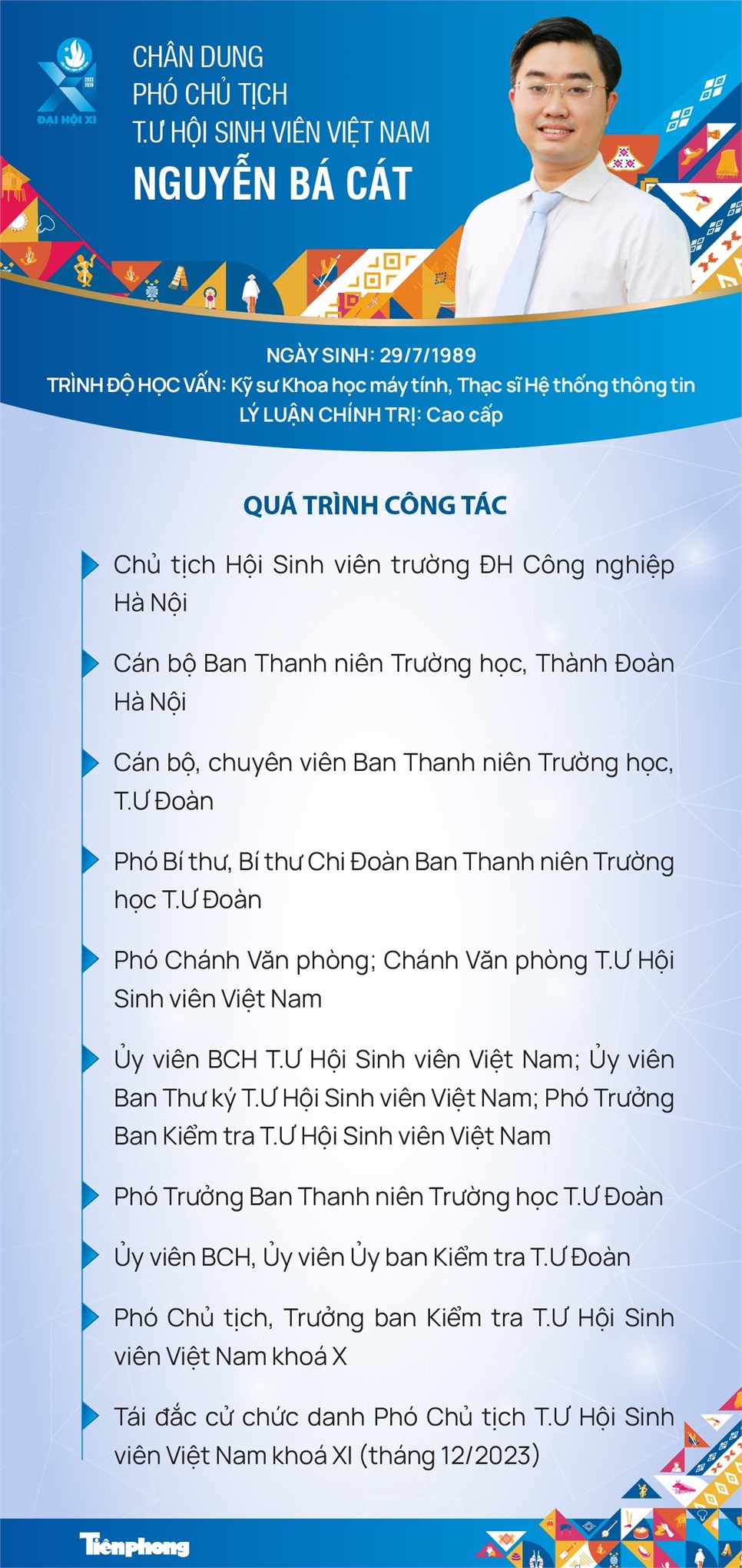 Tại Hội nghị lần thứ nhất Ban Chấp hành T.Ư Hội Sinh viên Việt Nam lần thứ XI, nhiệm kỳ 2023 – 2028, anh Nguyễn Bá Cát được tín nhiệm bầu giữ chức danh Phó Chủ tịch T.Ư Hội Sinh viên Việt Nam. Anh Nguyễn Bá Cát là cựu sinh viên khoa Công nghệ Thông tin, trường ĐH Công nghiệp Hà Nội, nguyên Chủ tịch HSV trường khoá IV.