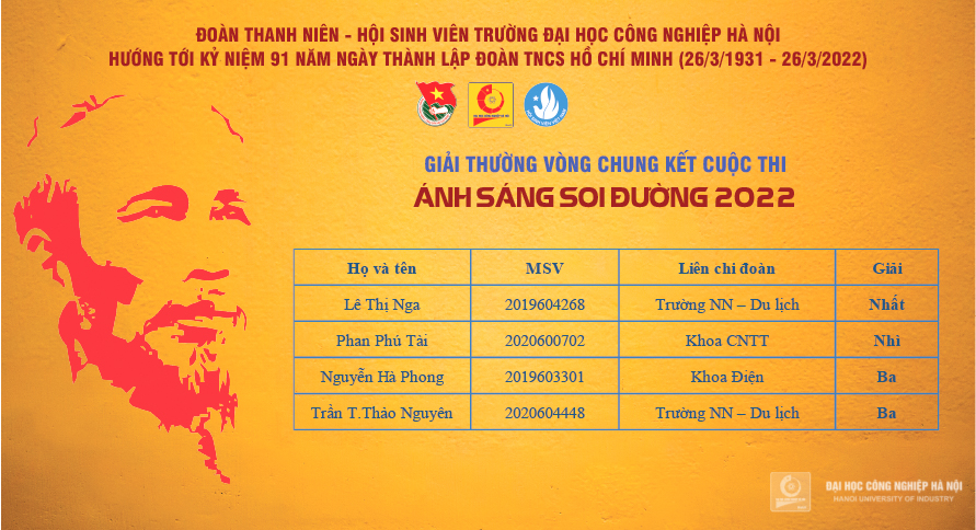 Tối ngày 29/03/2022, Chung kết cuộc thi “Ánh sáng soi đường năm 2022” diễn ra thành công tốt đẹp. Sinh viên Lê Thị Nga, trường Ngoại ngữ - Du lịch đã xuất sắc vượt qua 91 thí sinh để giành giải Nhất cuộc thi.