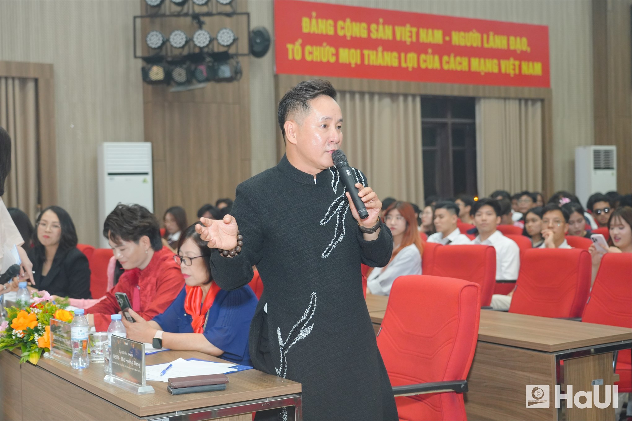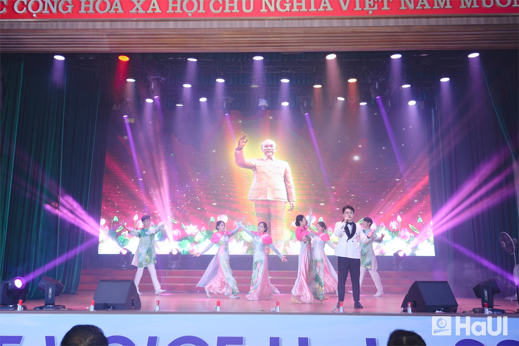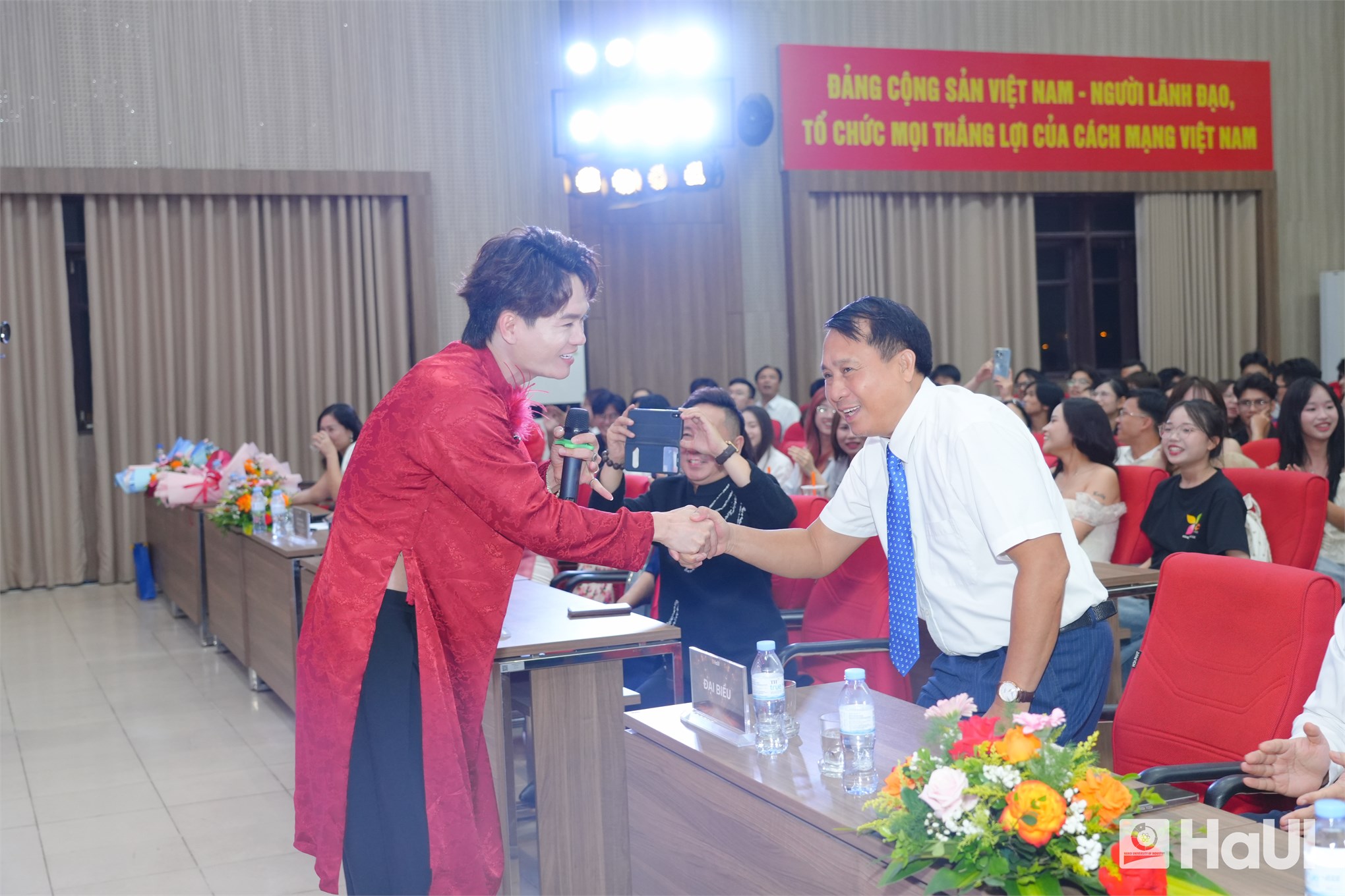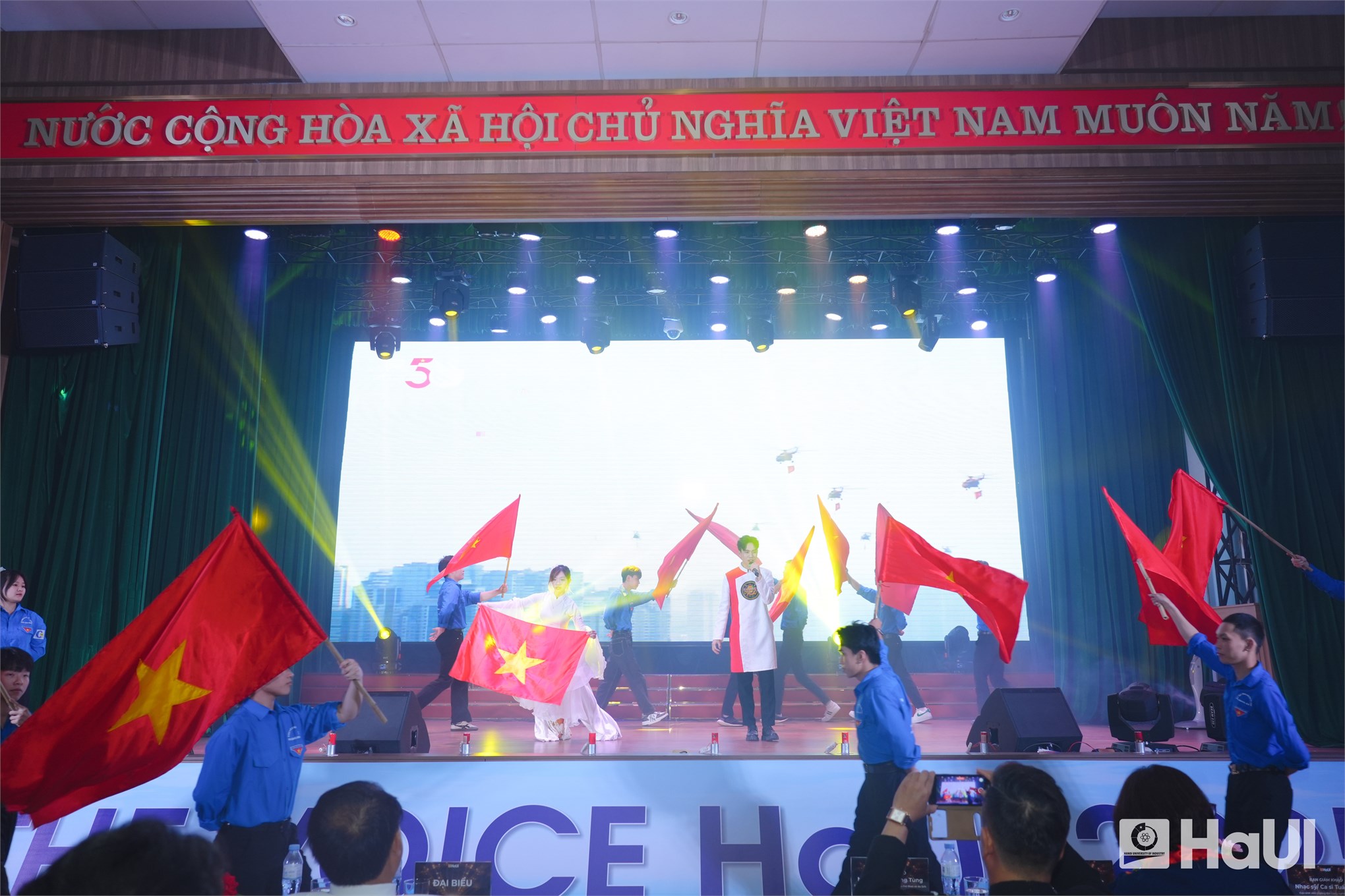 Sân khấu "The Voice HaUI 2025" đã thực sự bùng cháy trong đêm chung kết 10/06/2025, với một bữa tiệc âm nhạc đỉnh cao và đầy cảm xúc. Sự kiện là tuyên ngôn sống động cho triết lý giáo dục của Nhà trường: “Giáo dục toàn diện, vì sự phát triển bền vững và hội nhập”, tạo bệ phóng để sinh viên rèn luyện bản lĩnh, trí tuệ và tâm hồn. PGS.TS. Lê Hồng Quân, Bí thư Đảng ủy, Chủ tịch Hội đồng trường và TS. Nguyễn Văn Thiện, Phó Bí thư Đảng ủy, Phó Hiệu trưởng Nhà trường dự và chúc mừng các bạn sinh viên.