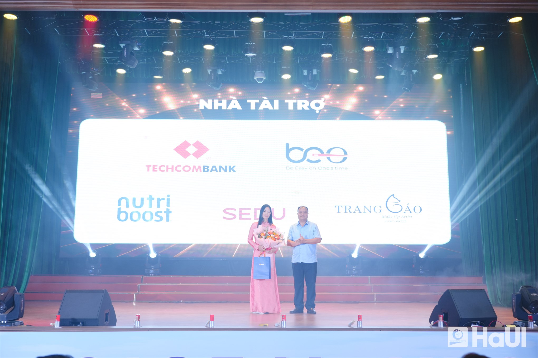 TS. Nguyễn Văn Thiện, Phó Bí thư Đảng ủy, Phó Hiệu trưởng Nhà trường tặng hoa tri ân nhà tài trợ của chương trình