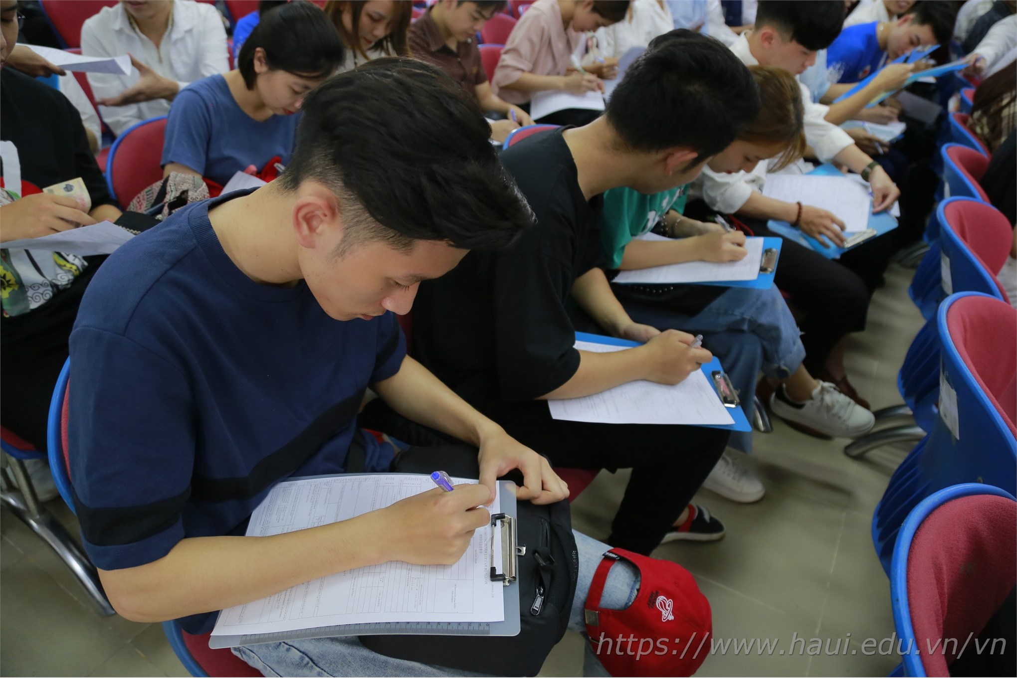 Các bạn sinh viên đang hoàn thiện thủ tục để chuẩn bị cho vòng phỏng vấn đầu tiên do Tập đoàn Hồng Hải trực tiếp tổ chức