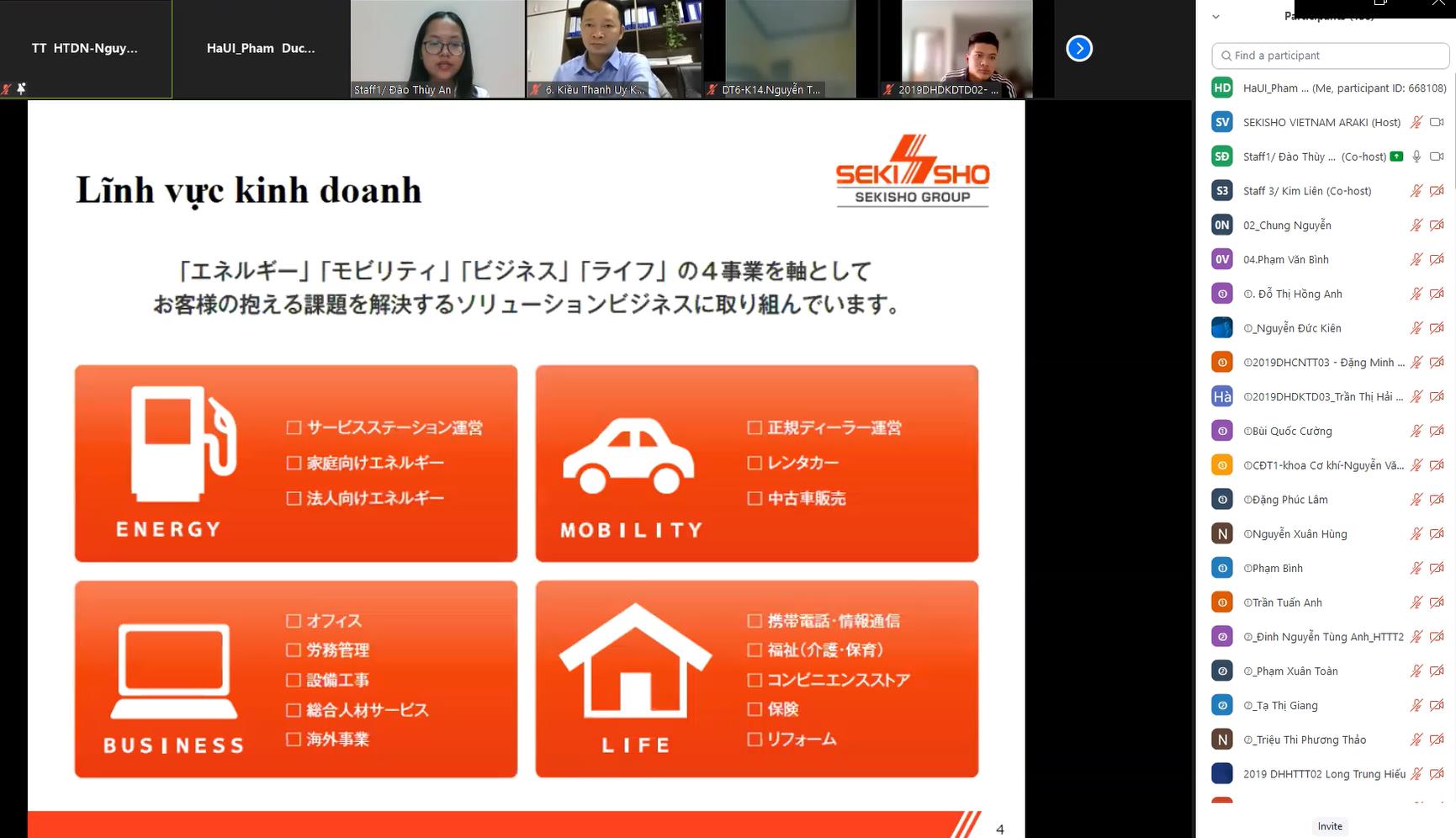 Giới thiệu về Tập đoàn Sekisho, chị Đào Thùy An - cán bộ phụ trách tuyển dụng và đào tạo cho biết: Tập đoàn Sekisho được thành lập từ năm 1908 có trụ sở chính ở Nhật Bản gồm 22 công ty con. Tại Việt Nam, công ty TNHH Sekisho Việt Nam chuyên cung cấp dịch vụ hỗ trợ tìm kiếm việc làm tại các doanh nghiệp Nhật Bản với 4 hoạt động cụ thể: (i) tổ chức hội thảo (ii) chỉnh sửa CV, tác phong phỏng vấn, (iii) tư vấn hướng nghiệp và (iv) giới thiệu nhà tuyển dụng.