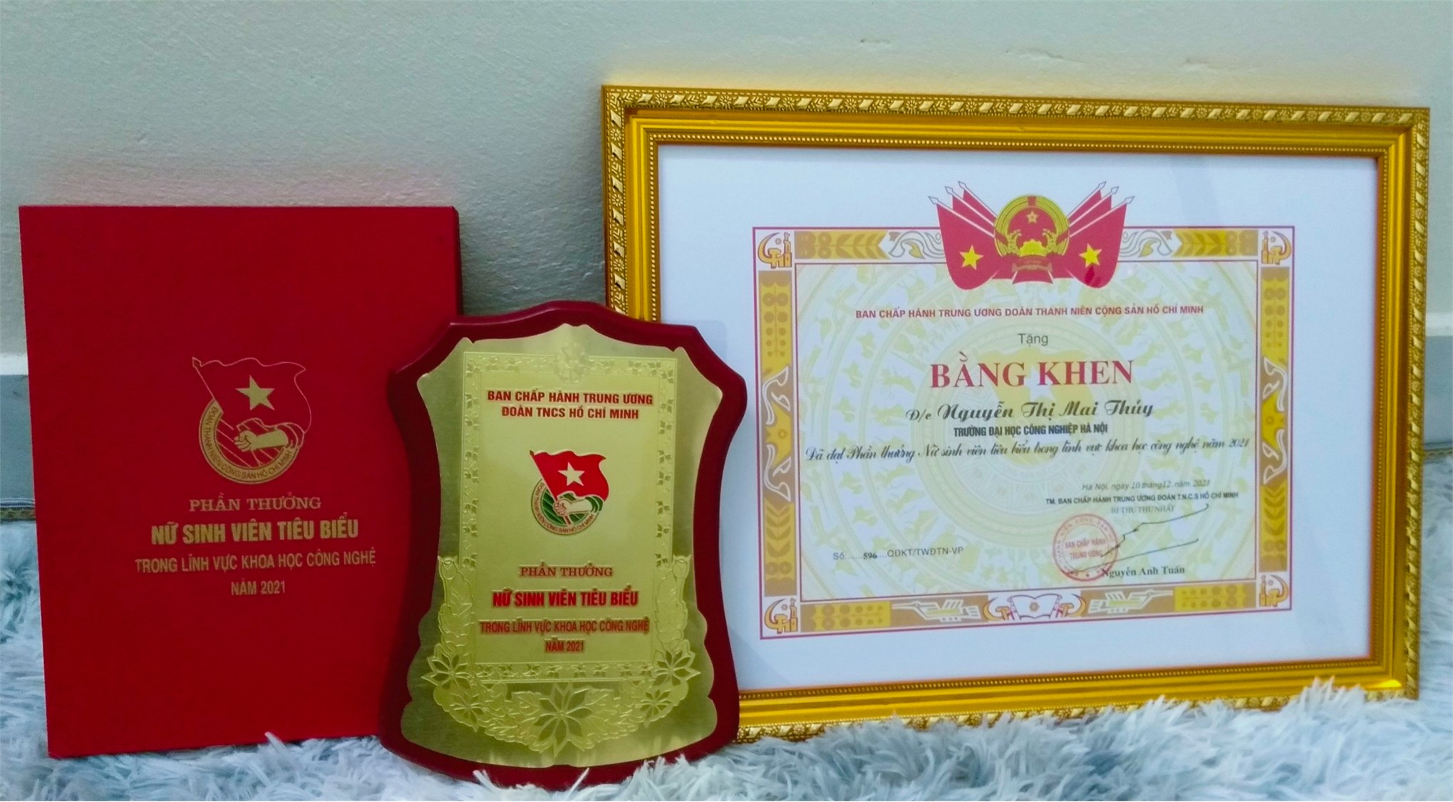 Mai Thủy chia sẻ : Nhớ lại năm 2020, khi biết tin mình đạt giải Nhì cuộc thi “Sinh viên nghiên cứu khoa học cấp trường 2020”, được nhận học bổng quốc tế Niotri năm 2021, mình thực sự rất vui, bởi sự nỗ lực, cố gắng của mình đã được đền đáp xứng đáng. Và năm nay, khi trở thành một trong 20 nữ sinh được nhận phần thưởng “Nữ sinh viên tiêu biểu trong lĩnh vực khoa học công nghệ (KHCN) năm 2021” do Trung ương Đoàn TNCS Hồ Chí Minh, Bộ Khoa học và Công nghệ phối hợp tổ chức, mình lại một lần nữa vỡ òa trong hạnh phúc…