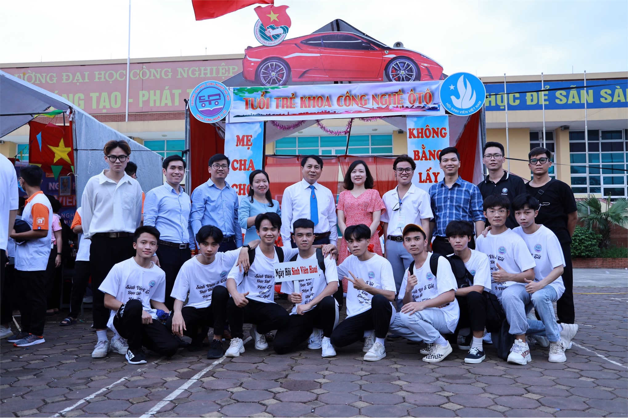 PGS.TS.Lê Hồng Quân – Chủ tịch Hội đồng Trường và TS.Nguyễn Thị Thu Hương- Giám đốc Trung tâm Truyền thông và Quan hệ công chúng chụp ảnh tại gian trại của Liên chi đoàn Khoa Công nghệ ô tô