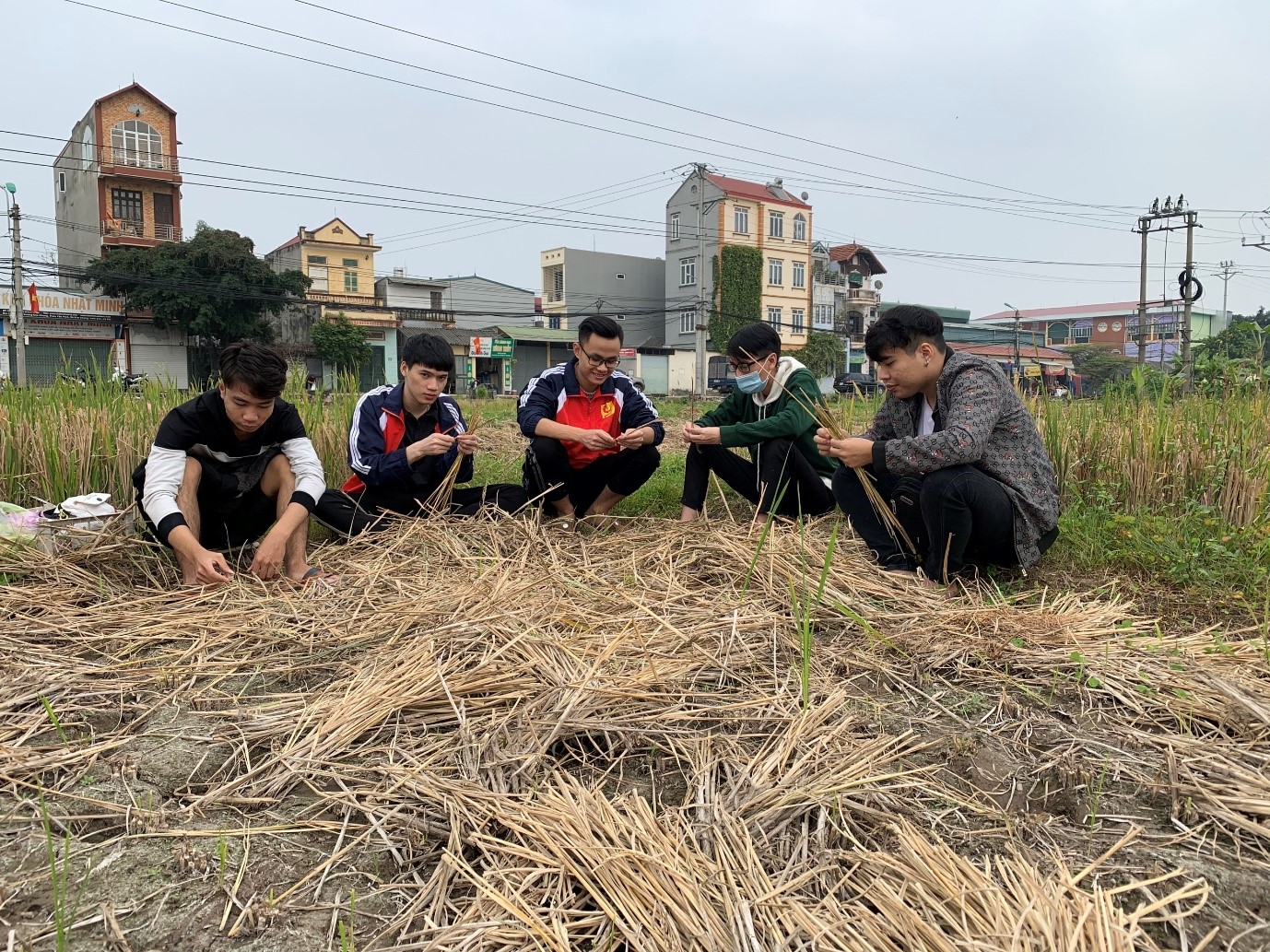 Nhóm nghiên cứu thu gom rơm rạ cho quy trình thực nghiệm