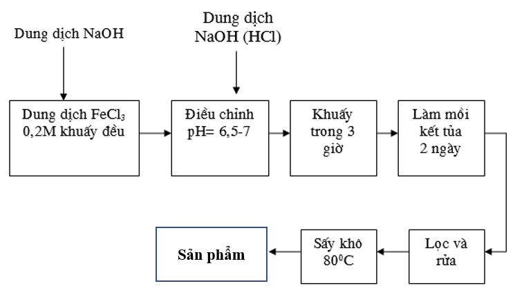 Vật liệu hấp phụ được tổng hợp theo sơ đồ bằng cách pha NaOH với cùng nồng độ với FeCl3 từ từ vào dung dịch FeCl3. Sau đó điều chỉnh pH của dung dịch về 6,5 đến 7 bằng dung dịch HCl 0,02M.