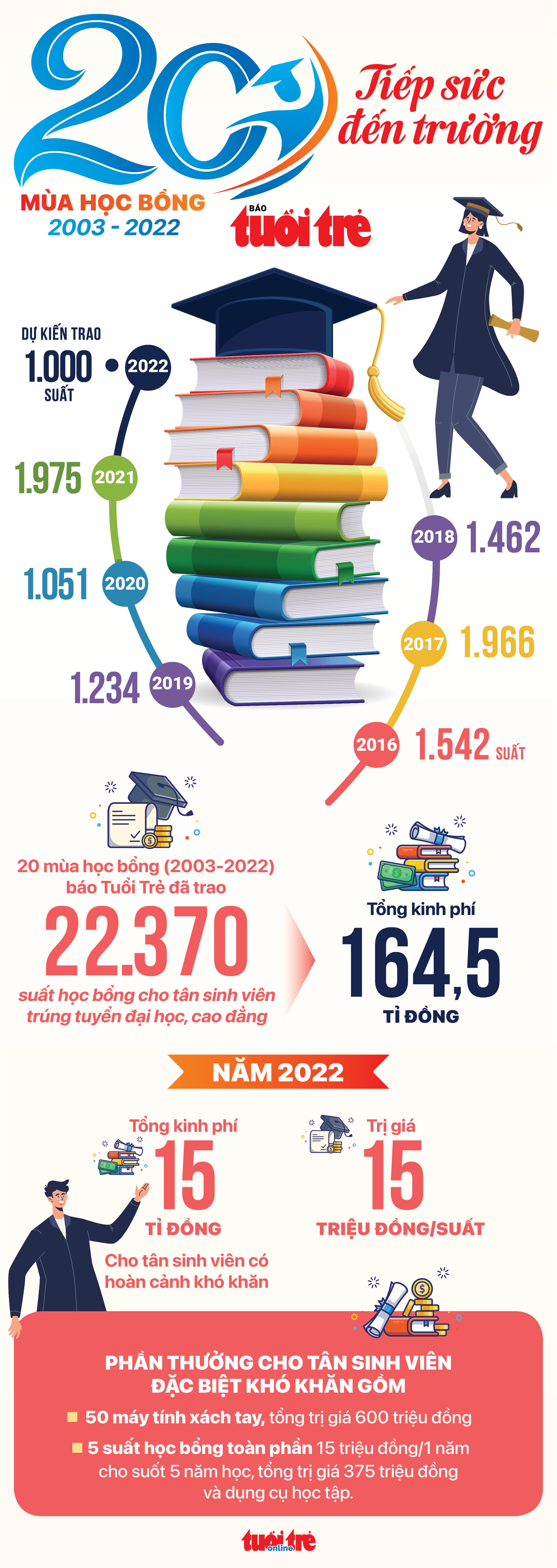 Mỗi học bổng 15 triệu đồng, tổng kinh phí hơn 900 triệu đồng do Quỹ Đồng hành nhà nông (Công ty cổ phần phân bón Bình Điền) và Quỹ khuyến học Vinacam (Công ty cổ phần Tập đoàn Vinacam) tài trợ.