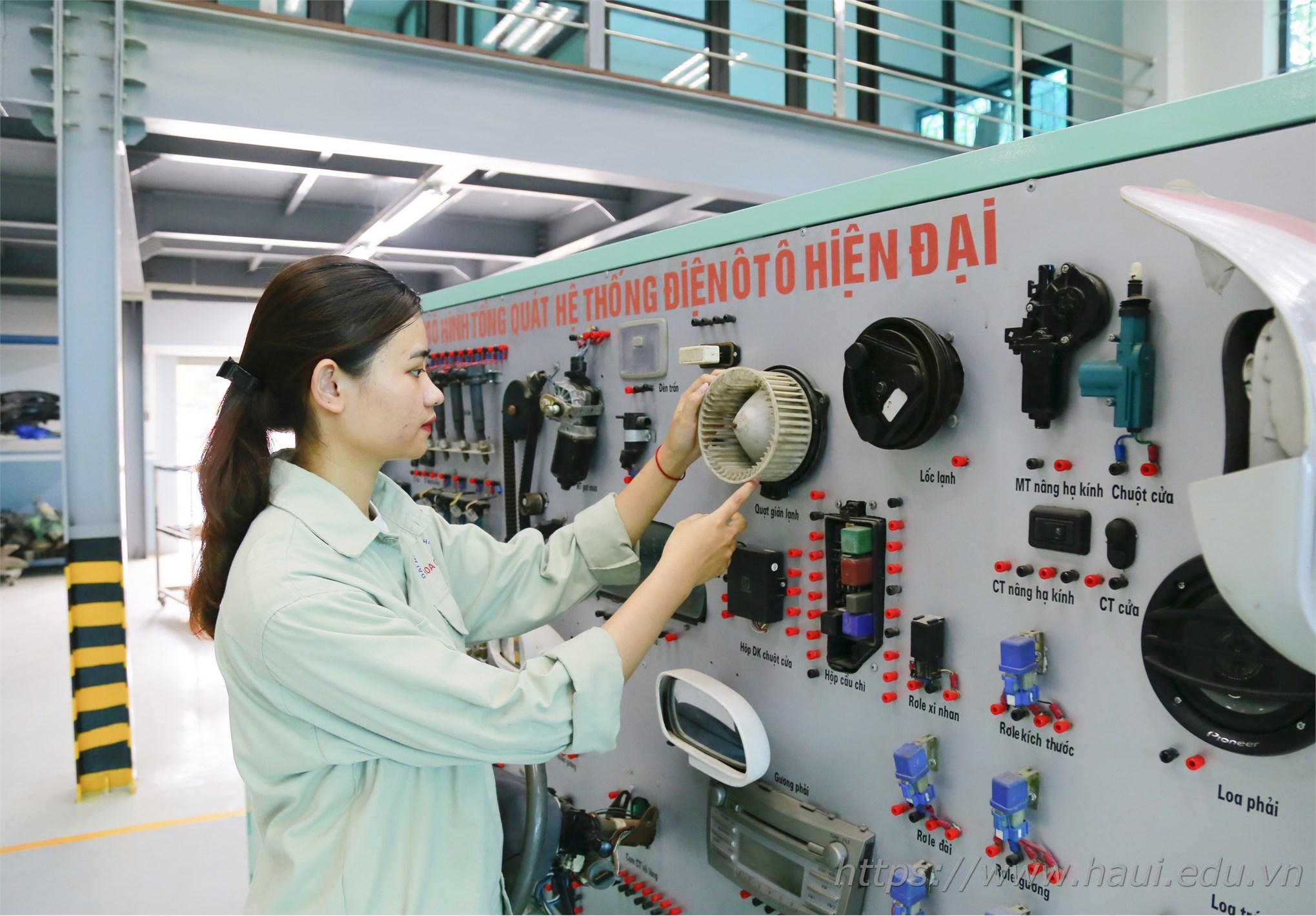 Cao Thị Mến đang thực hành trên hệ thống điện ô tô