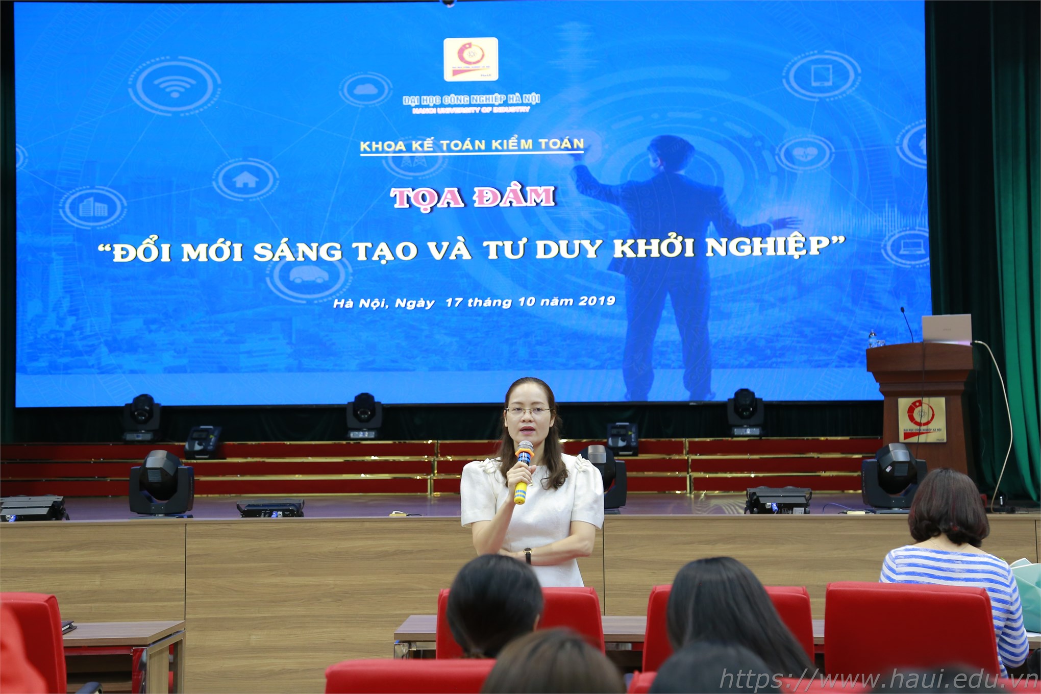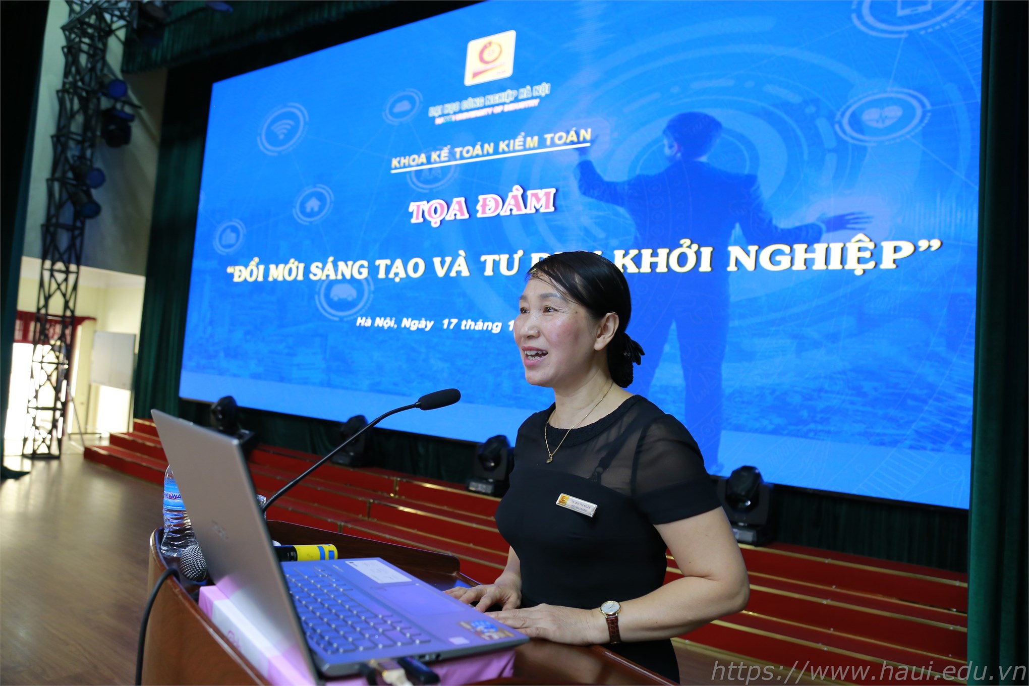 TS. Bùi Thị Ngân – Phó Hiệu trưởng Nhà trường phát biểu tại Tọa đàm “Đổi mới sáng tạo và tư duy khởi nghiệp”