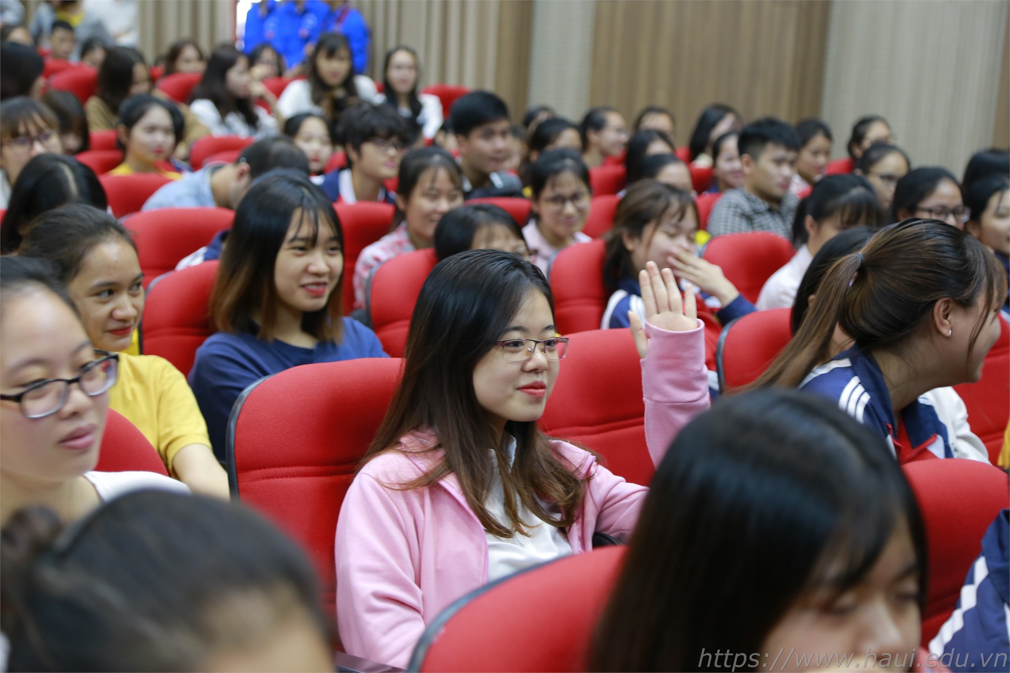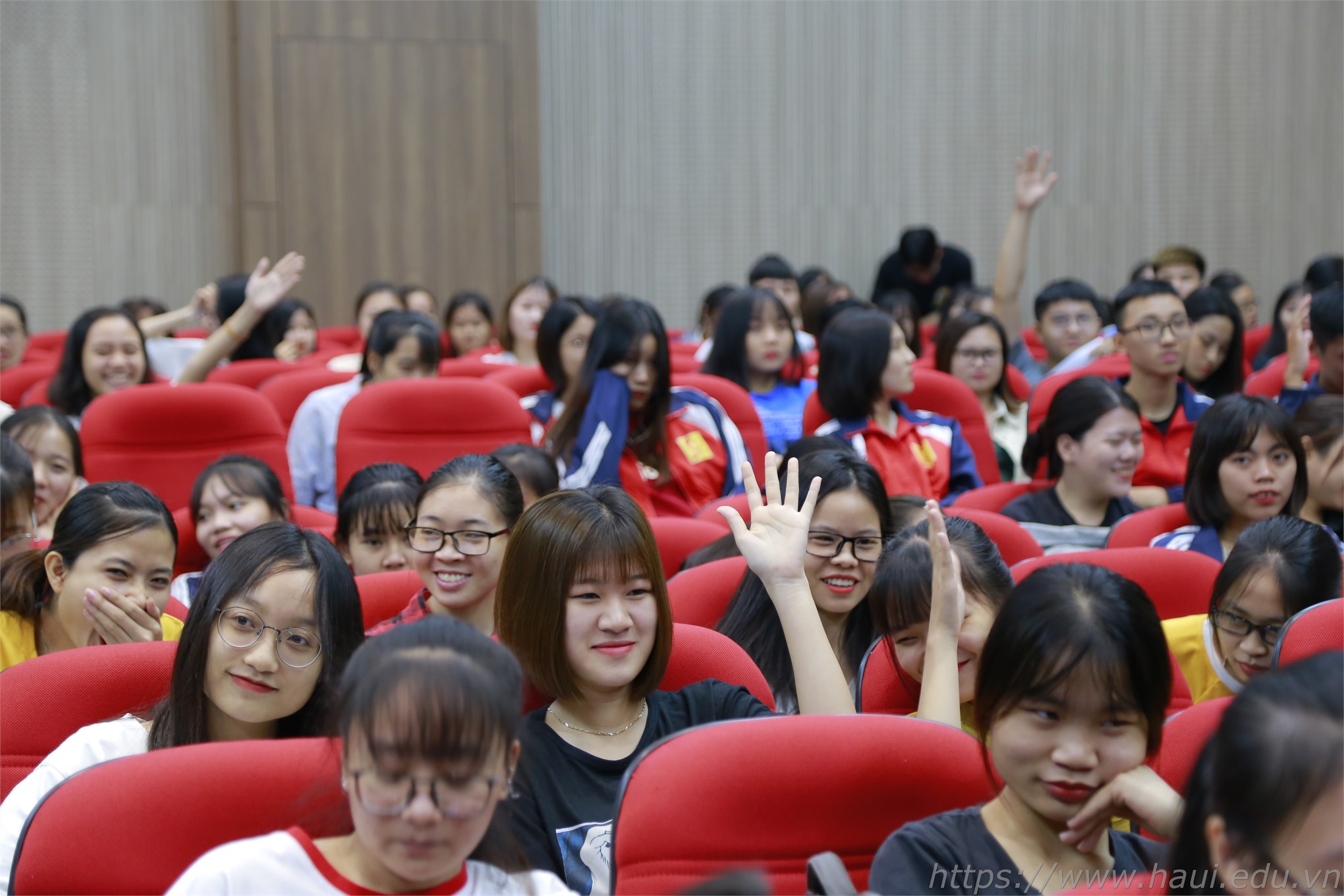 Các bạn sinh viên Khoa Kế toán Kiểm toán hào hứng trả lời những câu hỏi trong phần giao lưu của buổi Tọa đàm