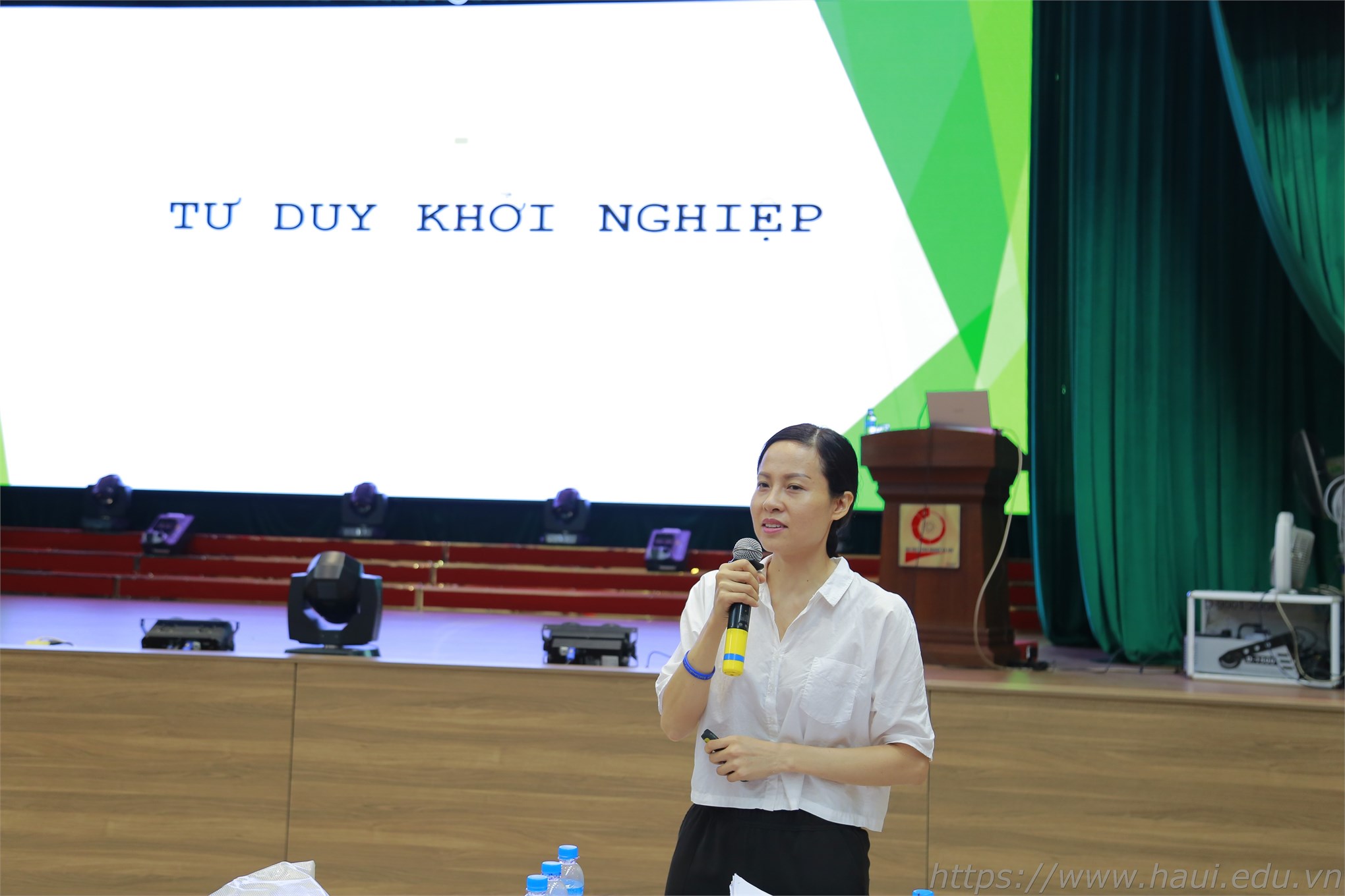 Nhấn mạnh về vai trò của tư duy khởi nghiệp và sự sáng tạo, TS. Bùi Thị Ngân – Phó Hiệu trưởng Nhà trường chia sẻ: Mỗi một bạn ngồi đây đều mang trong mình những hoài bão, khát vọng của tuổi trẻ. Vậy còn ngần ngại gì nữa, hãy tự tin là chính mình, dám nghĩ, dám làm, hãy dấn thân và đổi mới sáng tạo, có như vậy mới có thể thành công được.